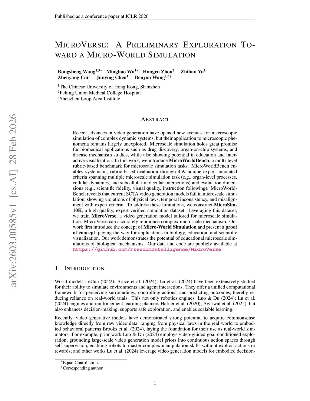 Recent advances in video generation have opened new avenues for macroscopic simulation of complex dynamic systems, but their application to microscopic phenomena remains largely unexplored. Microscale simulation holds great promise for biomedical applications such as drug discovery, organ-on-chip systems, and disease mechanism studies, while also showing potential in education and interactive visualization. In this work, we introduce MicroWorldBench, a multi-level rubric-based benchmark for microscale simulation tasks. MicroWorldBench enables systematic, rubric-based evaluation through 459 unique expert-annotated criteria spanning multiple microscale simulation task (e.g., organ-level processes, cellular dynamics, and subcellular molecular interactions) and evaluation dimensions (e.g., scientific fidelity, visual quality, instruction following). MicroWorldBench reveals that current SOTA video generation models fail in microscale simulation, showing violations of physical laws, temporal inconsistency, and misalignment with expert criteria. To address these limitations, we construct MicroSim-10K, a high-quality, expert-verified simulation dataset. Leveraging this dataset, we train MicroVerse, a video generation model tailored for microscale simulation. MicroVerse can accurately reproduce complex microscale mechanism. Our work first introduce the concept of Micro-World Simulation and present a proof of concept, paving the way for applications in biology, education, and scientific visualization. Our work demonstrates the potential of educational microscale simulations of biological mechanisms. Our data and code are publicly available atthis https URL