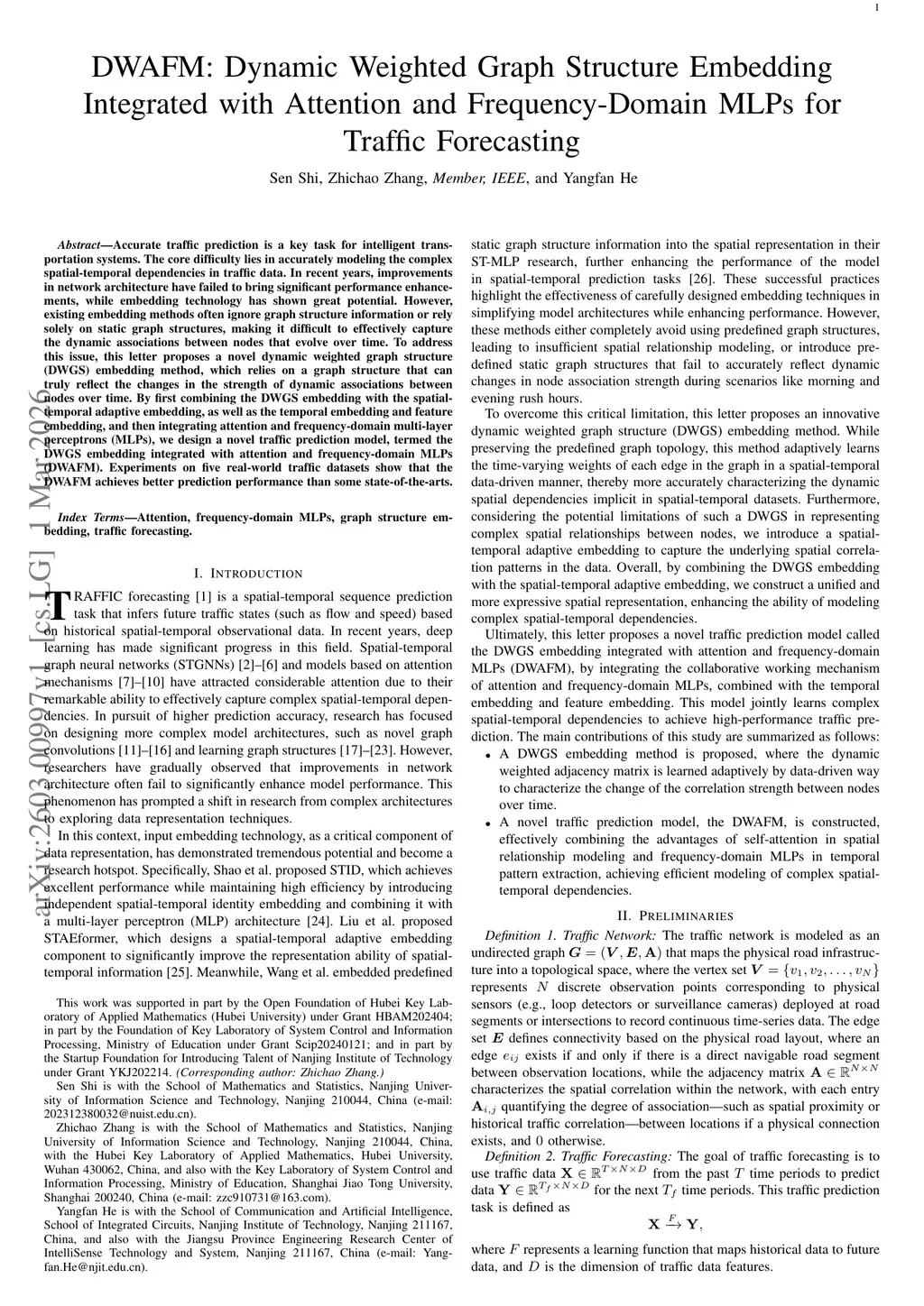 DWAFM: Dynamic Weighted Graph Structure Embedding Integrated with Attention and Frequency-Domain MLPs for Traffic Forecasting
