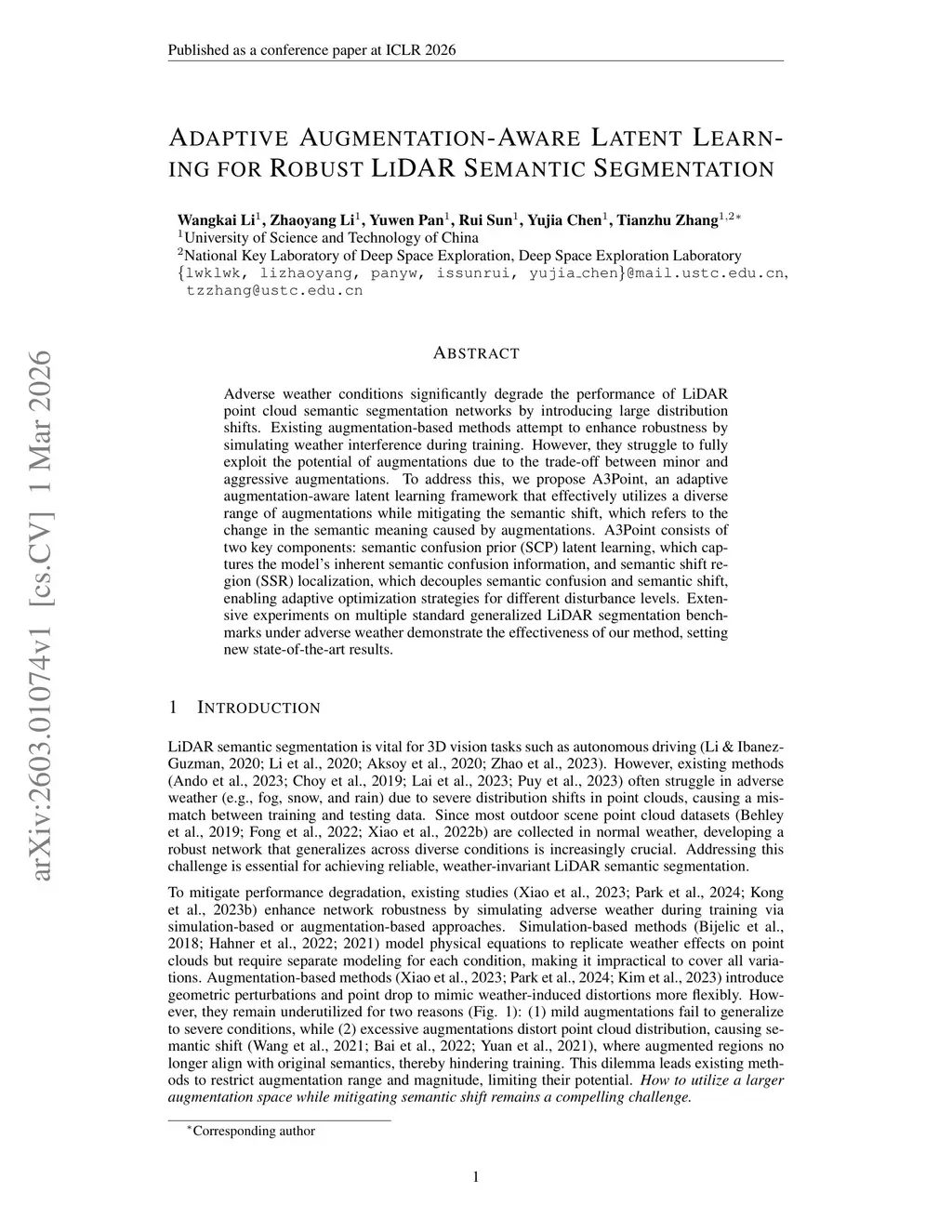 Adverse weather conditions significantly degrade the performance of LiDAR point cloud semantic segmentation networks by introducing large distribution shifts. Existing augmentation-based methods attempt to enhance robustness by simulating weather interference during training. However, they struggle to fully exploit the potential of augmentations due to the trade-off between minor and aggressive augmentations. To address this, we propose A3Point, an adaptive augmentation-aware latent learning framework that effectively utilizes a diverse range of augmentations while mitigating the semantic shift, which refers to the change in the semantic meaning caused by augmentations. A3Point consists of two key components: semantic confusion prior (SCP) latent learning, which captures the model's inherent semantic confusion information, and semantic shift region (SSR) localization, which decouples semantic confusion and semantic shift, enabling adaptive optimization strategies for different disturbance levels. Extensive experiments on multiple standard generalized LiDAR segmentation benchmarks under adverse weather demonstrate the effectiveness of our method, setting new state-of-the-art results.