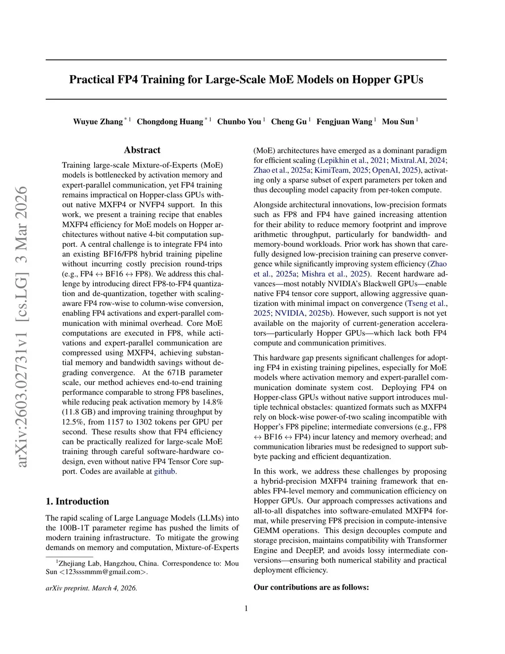 Training large-scale Mixture-of-Experts (MoE) models is bottlenecked by activation memory and expert-parallel communication, yet FP4 training remains impractical on Hopper-class GPUs without native MXFP4 or NVFP4 support. In this work, we present a training recipe that enables MXFP4 efficiency for MoE models on Hopper architectures without native 4-bit computation support. A central challenge is to integrate FP4 into an existing BF16/FP8 hybrid training pipeline without incurring costly precision round-trips (e.g., FP4 BF16 FP8). We address this challenge by introducing direct FP8-to-FP4 quantization and de-quantization, together with scaling-aware FP4 row-wise to column-wise conversion, enabling FP4 activations and expert-parallel communication with minimal overhead. Core MoE computations are executed in FP8, while activations and expert-parallel communication are compressed using MXFP4, achieving substantial memory and bandwidth savings without degrading convergence. At the 671B parameter scale, our method achieves end-to-end training performance comparable to strong FP8 baselines, while reducing peak activation memory by 14.8\% (11.8 GB) and improving training throughput by 12.5\%, from 1157 to 1302 tokens per GPU per second. These results show that FP4 efficiency can be practically realized for large-scale MoE training through careful software-hardware co-design, even without native FP4 Tensor Core support.