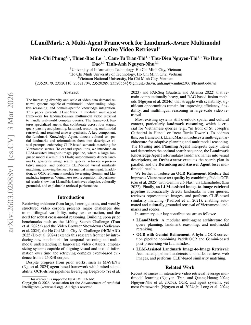 The increasing diversity and scale of video data demand retrieval systems capable of multimodal understanding, adaptive reasoning, and domain-specific knowledge integration. This paper presents LLandMark, a modular multi-agent framework for landmark-aware multimodal video retrieval to handle real-world complex queries. The framework features specialized agents that collaborate across four stages: query parsing and planning, landmark reasoning, multimodal retrieval, and reranked answer synthesis. A key component, the Landmark Knowledge Agent, detects cultural or spatial landmarks and reformulates them into descriptive visual prompts, enhancing CLIP-based semantic matching for Vietnamese scenes. To expand capabilities, we introduce an LLM-assisted image-to-image pipeline, where a large language model (Gemini 2.5 Flash) autonomously detects landmarks, generates image search queries, retrieves representative images, and performs CLIP-based visual similarity matching, removing the need for manual image input. In addition, an OCR refinement module leveraging Gemini and LlamaIndex improves Vietnamese text recognition. Experimental results show that LLandMark achieves adaptive, culturally grounded, and explainable retrieval performance.