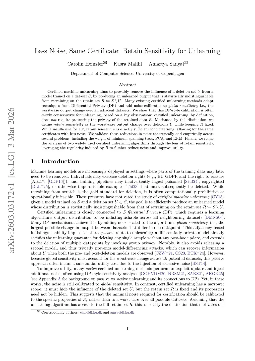 Certified machine unlearning aims to provably remove the influence of a deletion set from a model trained on a dataset , by producing an unlearned output that is statistically indistinguishable from retraining on the retain set . Many existing certified unlearning methods adapt techniques from Differential Privacy (DP) and add noise calibrated to global sensitivity, i.e., the worst-case output change over all adjacent datasets. We show that this DP-style calibration is often overly conservative for unlearning, based on a key observation: certified unlearning, by definition, does not require protecting the privacy of the retained data . Motivated by this distinction, we define retain sensitivity as the worst-case output change over deletions while keeping fixed. While insufficient for DP, retain sensitivity is exactly sufficient for unlearning, allowing for the same certificates with less noise. We validate these reductions in noise theoretically and empirically across several problems, including the weight of minimum spanning trees, PCA, and ERM. Finally, we refine the analysis of two widely used certified unlearning algorithms through the lens of retain sensitivity, leveraging the regularity induced by to further reduce noise and improve utility.