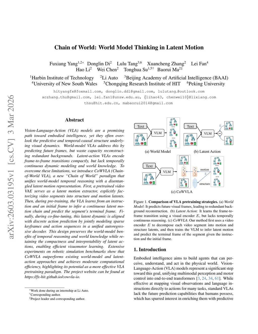 Vision-Language-Action (VLA) models are a promising path toward embodied intelligence, yet they often overlook the predictive and temporal-causal structure underlying visual dynamics. World-model VLAs address this by predicting future frames, but waste capacity reconstructing redundant backgrounds. Latent-action VLAs encode frame-to-frame transitions compactly, but lack temporally continuous dynamic modeling and world knowledge. To overcome these limitations, we introduce CoWVLA (Chain-of-World VLA), a new "Chain of World" paradigm that unifies world-model temporal reasoning with a disentangled latent motion representation. First, a pretrained video VAE serves as a latent motion extractor, explicitly factorizing video segments into structure and motion latents. Then, during pre-training, the VLA learns from an instruction and an initial frame to infer a continuous latent motion chain and predict the segment's terminal frame. Finally, during co-fine-tuning, this latent dynamic is aligned with discrete action prediction by jointly modeling sparse keyframes and action sequences in a unified autoregressive decoder. This design preserves the world-model benefits of temporal reasoning and world knowledge while retaining the compactness and interpretability of latent actions, enabling efficient visuomotor learning. Extensive experiments on robotic simulation benchmarks show that CoWVLA outperforms existing world-model and latent-action approaches and achieves moderate computational efficiency, highlighting its potential as a more effective VLA pretraining paradigm. The project website can be found atthis https URL.