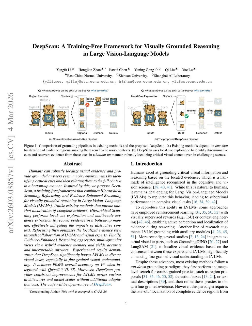 Humans can robustly localize visual evidence and provide grounded answers even in noisy environments by identifying critical cues and then relating them to the full context in a bottom-up manner. Inspired by this, we propose DeepScan, a training-free framework that combines Hierarchical Scanning, Refocusing, and Evidence-Enhanced Reasoning for visually grounded reasoning in Large Vision-Language Models (LVLMs). Unlike existing methods that pursue one-shot localization of complete evidence, Hierarchical Scanning performs local cue exploration and multi-scale evidence extraction to recover evidence in a bottom-up manner, effectively mitigating the impacts of distractive context. Refocusing then optimizes the localized evidence view through collaboration of LVLMs and visual experts. Finally, Evidence-Enhanced Reasoning aggregates multi-granular views via a hybrid evidence memory and yields accurate and interpretable answers. Experimental results demonstrate that DeepScan significantly boosts LVLMs in diverse visual tasks, especially in fine-grained visual understanding. It achieves 90.6% overall accuracy on V* when integrated with Qwen2.5-VL-7B. Moreover, DeepScan provides consistent improvements for LVLMs across various architectures and model scales without additional adaptation cost.