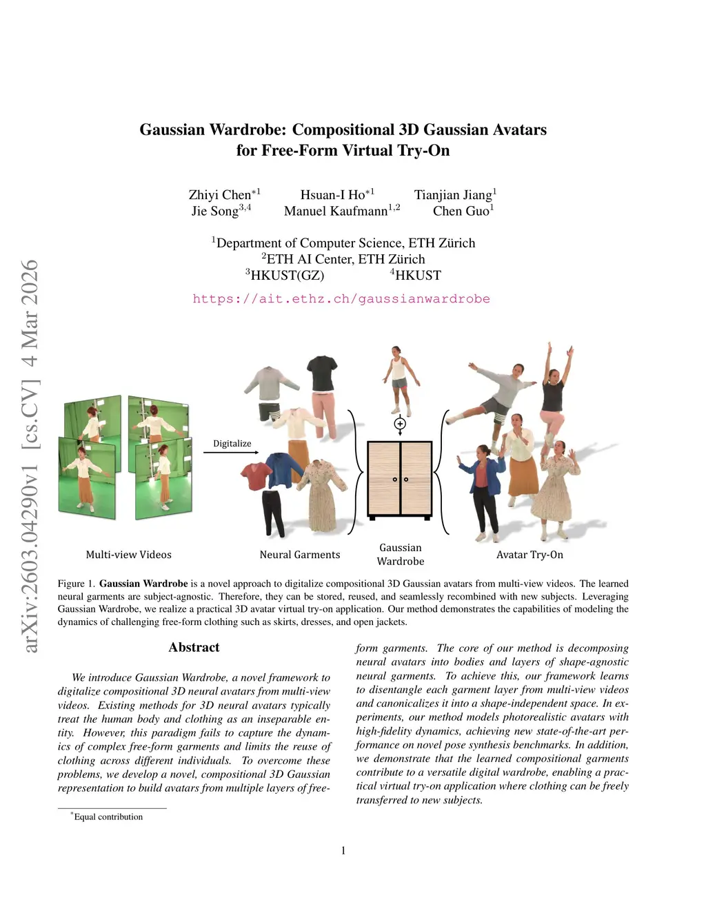 We introduce Gaussian Wardrobe, a novel framework to digitalize compositional 3D neural avatars from multi-view videos. Existing methods for 3D neural avatars typically treat the human body and clothing as an inseparable entity. However, this paradigm fails to capture the dynamics of complex free-form garments and limits the reuse of clothing across different individuals. To overcome these problems, we develop a novel, compositional 3D Gaussian representation to build avatars from multiple layers of free-form garments. The core of our method is decomposing neural avatars into bodies and layers of shape-agnostic neural garments. To achieve this, our framework learns to disentangle each garment layer from multi-view videos and canonicalizes it into a shape-independent space. In experiments, our method models photorealistic avatars with high-fidelity dynamics, achieving new state-of-the-art performance on novel pose synthesis benchmarks. In addition, we demonstrate that the learned compositional garments contribute to a versatile digital wardrobe, enabling a practical virtual try-on application where clothing can be freely transferred to new subjects. Project page:this https URL