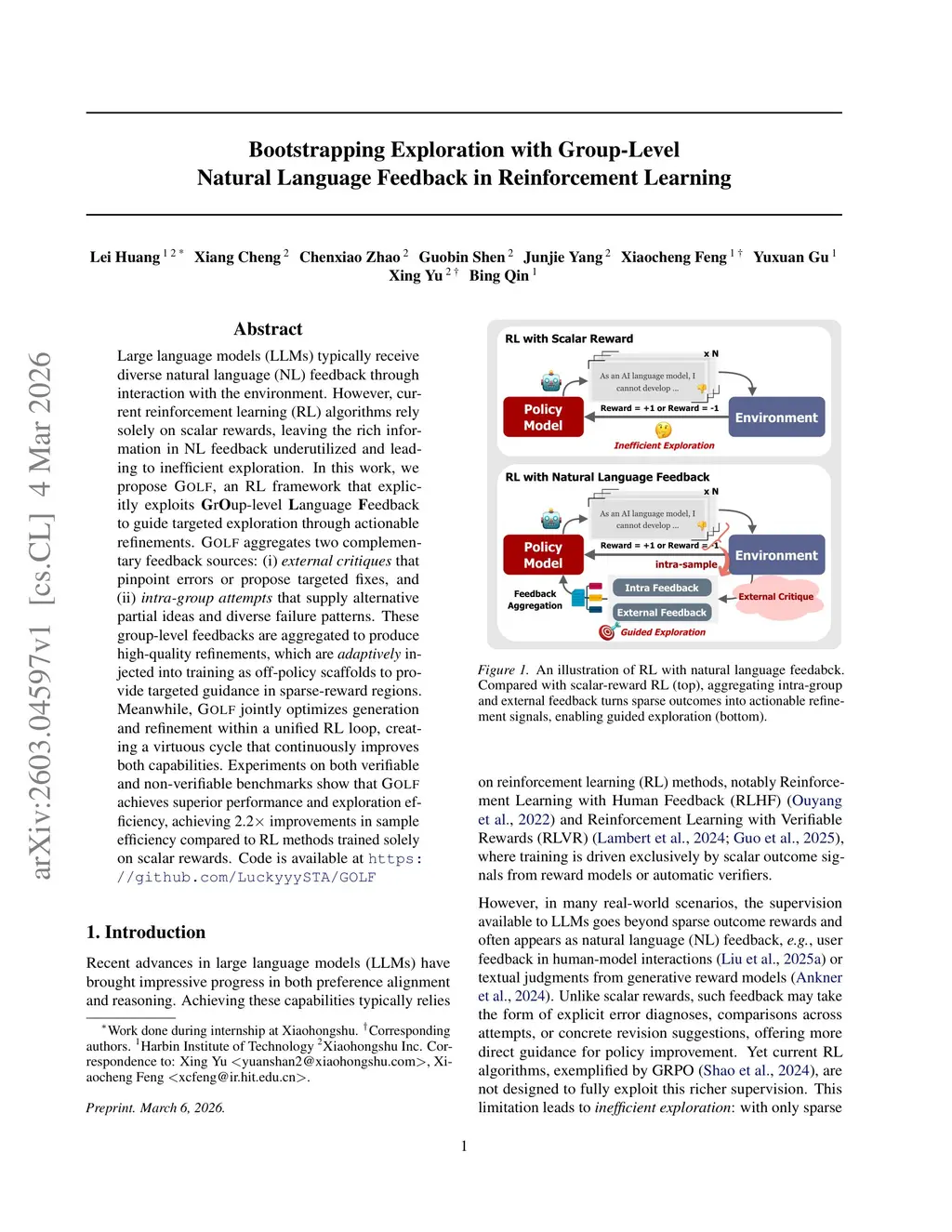 Large language models (LLMs) typically receive diverse natural language (NL) feedback through interaction with the environment. However, current reinforcement learning (RL) algorithms rely solely on scalar rewards, leaving the rich information in NL feedback underutilized and leading to inefficient exploration. In this work, we propose GOLF, an RL framework that explicitly exploits group-level language feedback to guide targeted exploration through actionable refinements. GOLF aggregates two complementary feedback sources: (i) external critiques that pinpoint errors or propose targeted fixes, and (ii) intra-group attempts that supply alternative partial ideas and diverse failure patterns. These group-level feedbacks are aggregated to produce high-quality refinements, which are adaptively injected into training as off-policy scaffolds to provide targeted guidance in sparse-reward regions. Meanwhile, GOLF jointly optimizes generation and refinement within a unified RL loop, creating a virtuous cycle that continuously improves both capabilities. Experiments on both verifiable and non-verifiable benchmarks show that GOLF achieves superior performance and exploration efficiency, achieving 2.2 improvements in sample efficiency compared to RL methods trained solely on scalar rewards. Code is available atthis https URL.