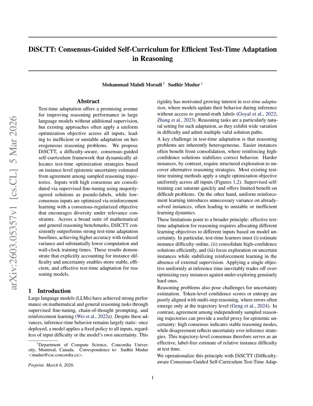 Test-time adaptation offers a promising avenue for improving reasoning performance in large language models without additional supervision, but existing approaches often apply a uniform optimization objective across all inputs, leading to inefficient or unstable adaptation on heterogeneous reasoning problems. We propose DiSCTT, a difficulty-aware, consensus-guided self-curriculum framework that dynamically allocates test-time optimization strategies based on instance-level epistemic uncertainty estimated from agreement among sampled reasoning trajectories. Inputs with high consensus are consolidated via supervised fine-tuning using majority-agreed solutions as pseudo-labels, while low-consensus inputs are optimized via reinforcement learning with a consensus-regularized objective that encourages diversity under relevance constraints. Across a broad suite of mathematical and general reasoning benchmarks, DiSCTT consistently outperforms strong test-time adaptation baselines, achieving higher accuracy with reduced variance and substantially lower computation and wall-clock training times. These results demonstrate that explicitly accounting for instance difficulty and uncertainty enables more stable, efficient, and effective test-time adaptation for reasoning models.