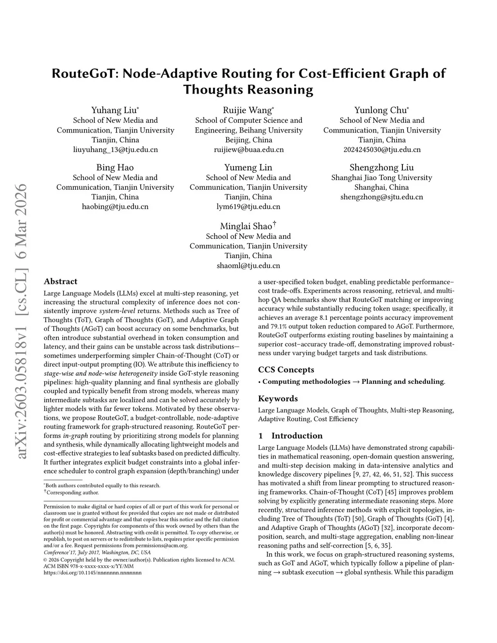 Large Language Models (LLMs) excel at multi-step reasoning, yet increasing the structural complexity of inference does not consistently improve system-level returns. Methods such as Tree of Thoughts (ToT), Graph of Thoughts (GoT), and Adaptive Graph of Thoughts (AGoT) can boost accuracy on some benchmarks, but often introduce substantial overhead in token consumption and latency, and their gains can be unstable across task distributions-sometimes underperforming simpler Chain-of-Thought (CoT) or direct input-output prompting (IO). We attribute this inefficiency to stage-wise and node-wise heterogeneity inside GoT-style reasoning pipelines: high-quality planning and final synthesis are globally coupled and typically benefit from strong models, whereas many intermediate subtasks are localized and can be solved accurately by lighter models with far fewer tokens. Motivated by these observations, we propose RouteGoT, a budget-controllable, node-adaptive routing framework for graph-structured reasoning. RouteGoT performs in-graph routing by prioritizing strong models for planning and synthesis, while dynamically allocating lightweight models and cost-effective strategies to leaf subtasks based on predicted difficulty. It further integrates explicit budget constraints into a global inference scheduler to control graph expansion under a user-specified token budget, enabling predictable performance-cost trade-offs. Experiments across reasoning, retrieval, and multi-hop QA benchmarks show that RouteGoT matching or improving accuracy while substantially reducing token usage; specifically, it achieves an average 8.1 percentage points accuracy improvement and 79.1\% output token reduction compared to AGoT. Furthermore, RouteGoT outperforms existing routing baselines by maintaining a superior cost-accuracy trade-off, demonstrating improved robustness under varying budget targets and tasks.