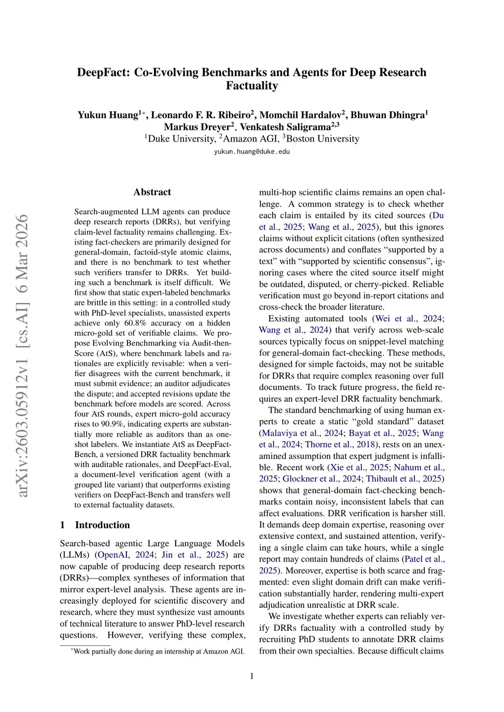 Search-augmented LLM agents can produce deep research reports (DRRs), but verifying claim-level factuality remains challenging. Existing fact-checkers are primarily designed for general-domain, factoid-style atomic claims, and there is no benchmark to test whether such verifiers transfer to DRRs. Yet building such a benchmark is itself difficult. We first show that static expert-labeled benchmarks are brittle in this setting: in a controlled study with PhD-level specialists, unassisted experts achieve only 60.8% accuracy on a hidden micro-gold set of verifiable claims. We propose Evolving Benchmarking via Audit-then-Score (AtS), where benchmark labels and rationales are explicitly revisable: when a verifier disagrees with the current benchmark, it must submit evidence; an auditor adjudicates the dispute; and accepted revisions update the benchmark before models are scored. Across four AtS rounds, expert micro-gold accuracy rises to 90.9%, indicating experts are substantially more reliable as auditors than as one-shot labelers. We instantiate AtS as DeepFact-Bench, a versioned DRR factuality benchmark with auditable rationales, and DeepFact-Eval, a document-level verification agent (with a grouped lite variant) that outperforms existing verifiers on DeepFact-Bench and transfers well to external factuality datasets.
