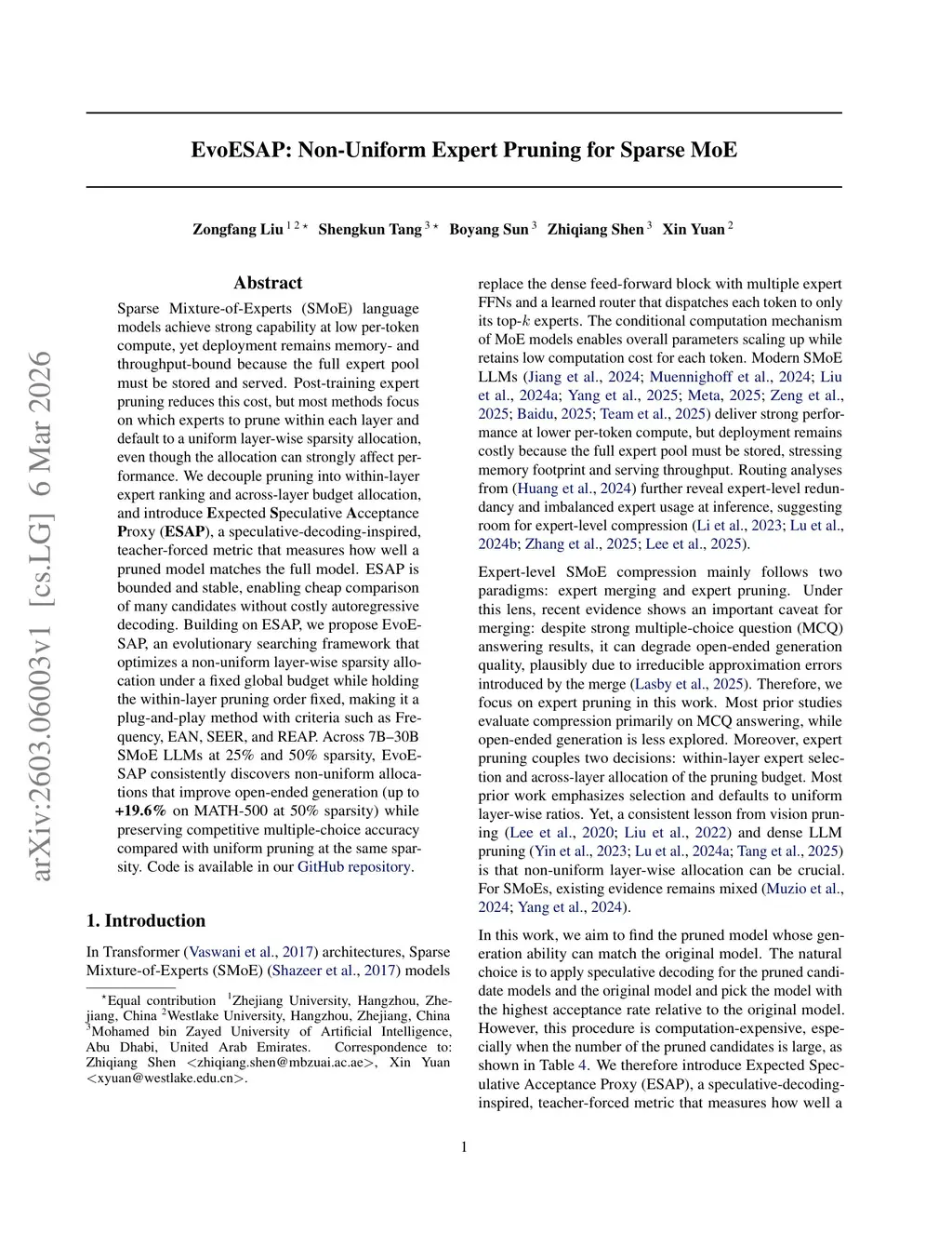 Sparse Mixture-of-Experts (SMoE) language models achieve strong capability at low per-token compute, yet deployment remains memory- and throughput-bound because the full expert pool must be stored and served. Post-training expert pruning reduces this cost, but most methods focus on which experts to prune within each layer and default to a uniform layer-wise sparsity allocation, even though the allocation can strongly affect performance. We decouple pruning into within-layer expert ranking and across-layer budget allocation, and introduce \textbf{E}xpected \textbf{S}peculative \textbf{A}cceptance \textbf{P}roxy (\textbf{ESAP}), a speculative-decoding-inspired, teacher-forced metric that measures how well a pruned model matches the full model. ESAP is bounded and stable, enabling cheap comparison of many candidates without costly autoregressive decoding. Building on ESAP, we propose EvoESAP, an evolutionary searching framework that optimizes a non-uniform layer-wise sparsity allocation under a fixed global budget while holding the within-layer pruning order fixed, making it a plug-and-play method with criteria such as Frequency, EAN, SEER, and REAP. Across 7B--30B SMoE LLMs at 25\% and 50\% sparsity, EvoESAP consistently discovers non-uniform allocations that improve open-ended generation (up to \textbf{+19.6\%} on MATH-500 at 50\% sparsity) while preserving competitive multiple-choice accuracy compared with uniform pruning at the same sparsity.