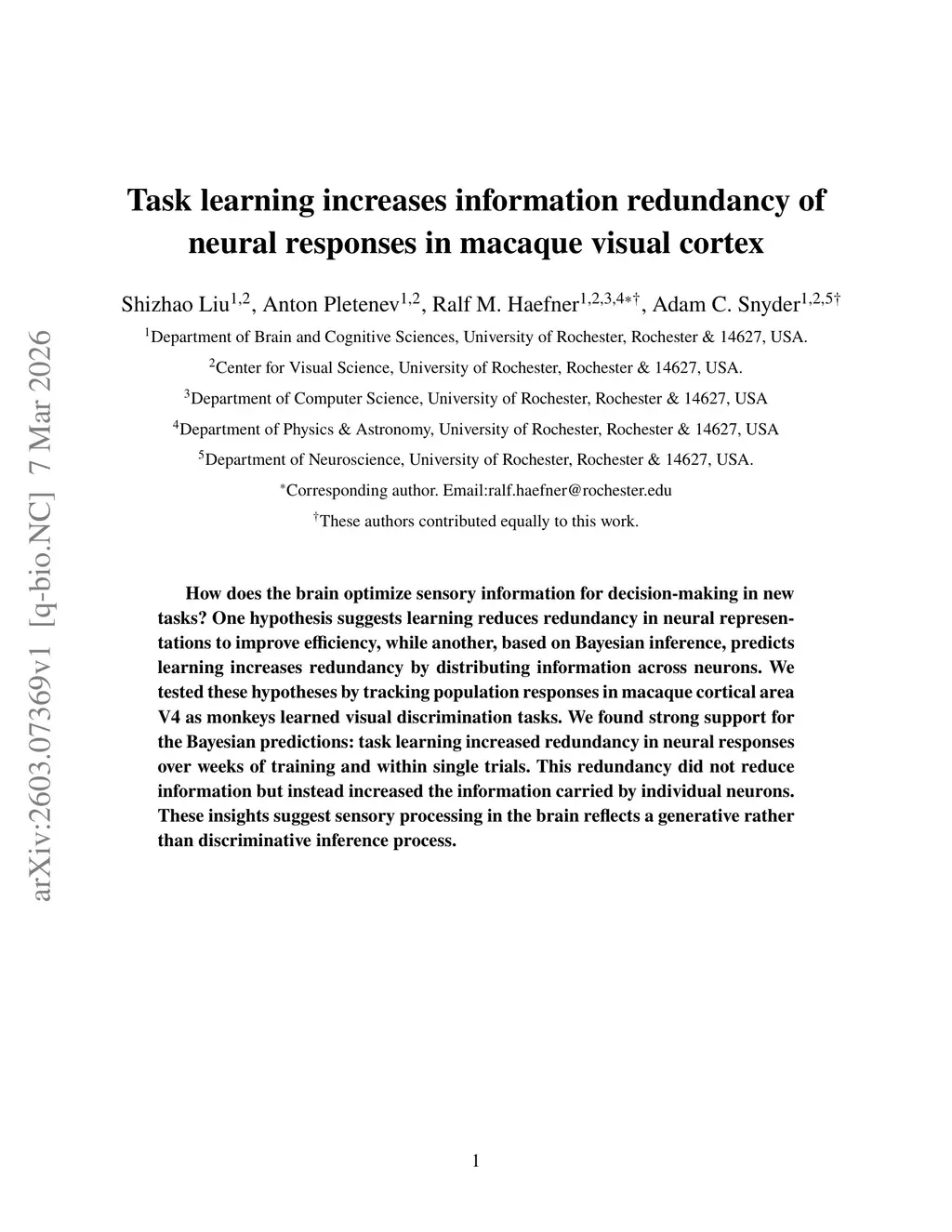 How does the brain optimize sensory information for decision-making in new tasks? One hypothesis suggests learning reduces redundancy in neural representations to improve efficiency, while another, based on Bayesian inference, predicts learning increases redundancy by distributing information across neurons. We tested these hypotheses by tracking population responses in macaque cortical area V4 as monkeys learned visual discrimination tasks. We found strong support for the Bayesian predictions: task learning increased redundancy in neural responses over weeks of training and within single trials. This redundancy did not reduce information but instead increased the information carried by individual neurons. These insights suggest sensory processing in the brain reflects a generative rather than discriminative inference process.
