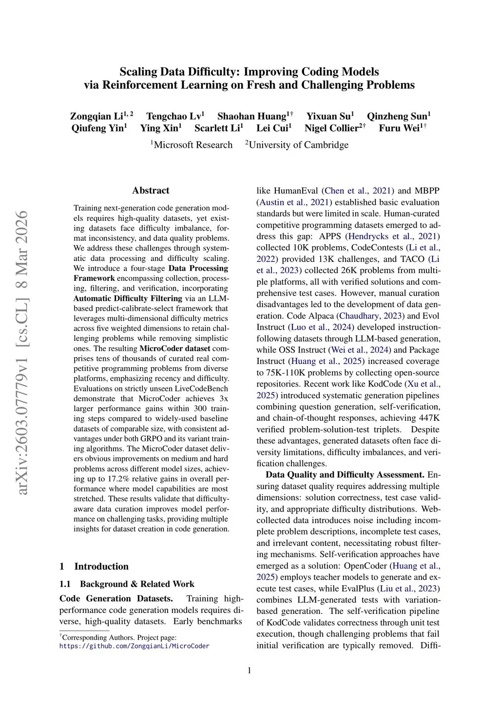 Training next-generation code generation models requires high-quality datasets, yet existing datasets face difficulty imbalance, format inconsistency, and data quality problems. We address these challenges through systematic data processing and difficulty scaling. We introduce a four-stage Data Processing Framework encompassing collection, processing, filtering, and verification, incorporating Automatic Difficulty Filtering via an LLM-based predict-calibrate-select framework that leverages multi-dimensional difficulty metrics across five weighted dimensions to retain challenging problems while removing simplistic ones. The resulting MicroCoder dataset comprises tens of thousands of curated real competitive programming problems from diverse platforms, emphasizing recency and difficulty. Evaluations on strictly unseen LiveCodeBench demonstrate that MicroCoder achieves 3x larger performance gains within 300 training steps compared to widely-used baseline datasets of comparable size, with consistent advantages under both GRPO and its variant training algorithms. The MicroCoder dataset delivers obvious improvements on medium and hard problems across different model sizes, achieving up to 17.2% relative gains in overall performance where model capabilities are most stretched. These results validate that difficulty-aware data curation improves model performance on challenging tasks, providing multiple insights for dataset creation in code generation.