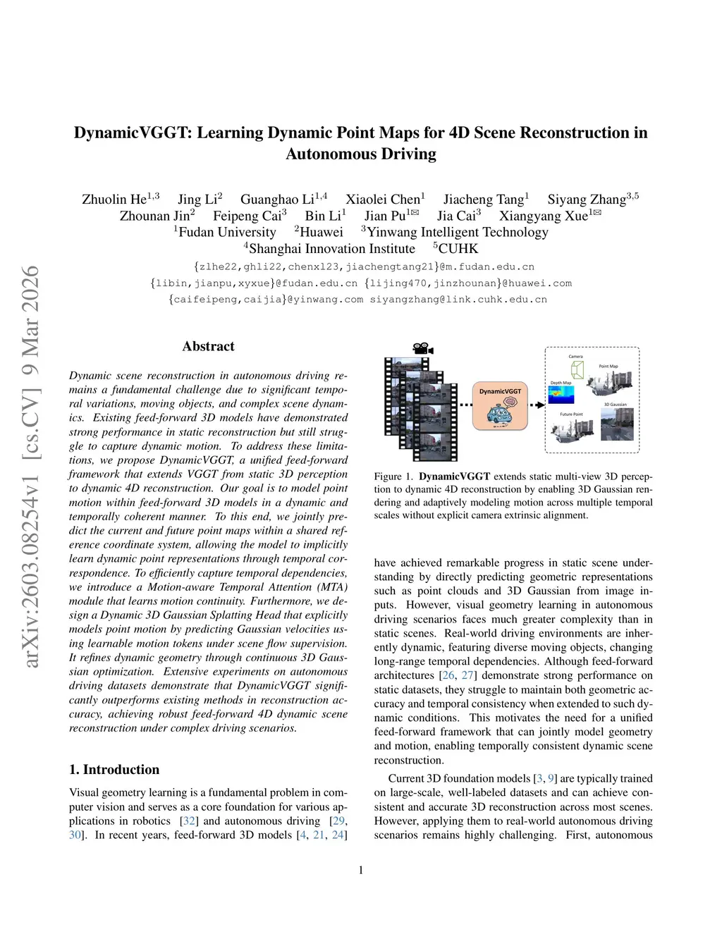Dynamic scene reconstruction in autonomous driving remains a fundamental challenge due to significant temporal variations, moving objects, and complex scene dynamics. Existing feed-forward 3D models have demonstrated strong performance in static reconstruction but still struggle to capture dynamic motion. To address these limitations, we propose DynamicVGGT, a unified feed-forward framework that extends VGGT from static 3D perception to dynamic 4D reconstruction. Our goal is to model point motion within feed-forward 3D models in a dynamic and temporally coherent manner. To this end, we jointly predict the current and future point maps within a shared reference coordinate system, allowing the model to implicitly learn dynamic point representations through temporal correspondence. To efficiently capture temporal dependencies, we introduce a Motion-aware Temporal Attention (MTA) module that learns motion continuity. Furthermore, we design a Dynamic 3D Gaussian Splatting Head that explicitly models point motion by predicting Gaussian velocities using learnable motion tokens under scene flow supervision. It refines dynamic geometry through continuous 3D Gaussian optimization. Extensive experiments on autonomous driving datasets demonstrate that DynamicVGGT significantly outperforms existing methods in reconstruction accuracy, achieving robust feed-forward 4D dynamic scene reconstruction under complex driving scenarios.