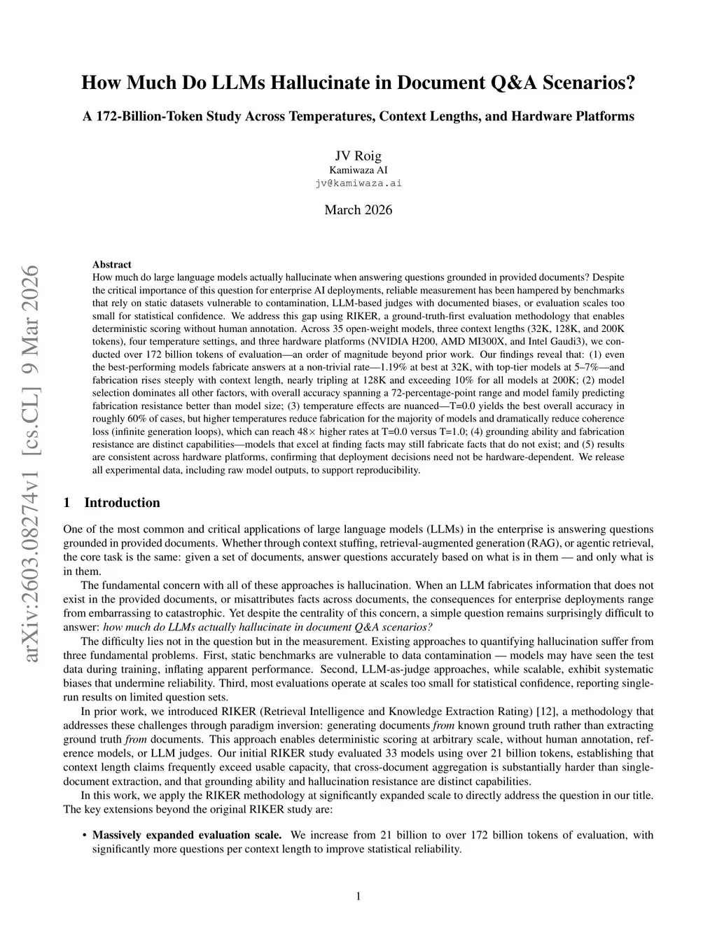 How much do large language models actually hallucinate when answering questions grounded in provided documents? Despite the critical importance of this question for enterprise AI deployments, reliable measurement has been hampered by benchmarks that rely on static datasets vulnerable to contamination, LLM-based judges with documented biases, or evaluation scales too small for statistical confidence. We address this gap using RIKER, a ground-truth-first evaluation methodology that enables deterministic scoring without human annotation. Across 35 open-weight models, three context lengths (32K, 128K, and 200K tokens), four temperature settings, and three hardware platforms (NVIDIA H200, AMD MI300X, and Intel Gaudi 3), we conducted over 172 billion tokens of evaluation - an order of magnitude beyond prior work. Our findings reveal that: (1) even the best-performing models fabricate answers at a non-trivial rate - 1.19% at best at 32K, with top-tier models at 5 - 7% - and fabrication rises steeply with context length, nearly tripling at 128K and exceeding 10% for all models at 200K; (2) model selection dominates all other factors, with overall accuracy spanning a 72-percentage-point range and model family predicting fabrication resistance better than model size; (3) temperature effects are nuanced - T=0.0 yields the best overall accuracy in roughly 60% of cases, but higher temperatures reduce fabrication for the majority of models and dramatically reduce coherence loss (infinite generation loops), which can reach 48x higher rates at T=0.0 versus T=1.0; (4) grounding ability and fabrication resistance are distinct capabilities - models that excel at finding facts may still fabricate facts that do not exist; and (5) results are consistent across hardware platforms, confirming that deployment decisions need not be hardware-dependent.