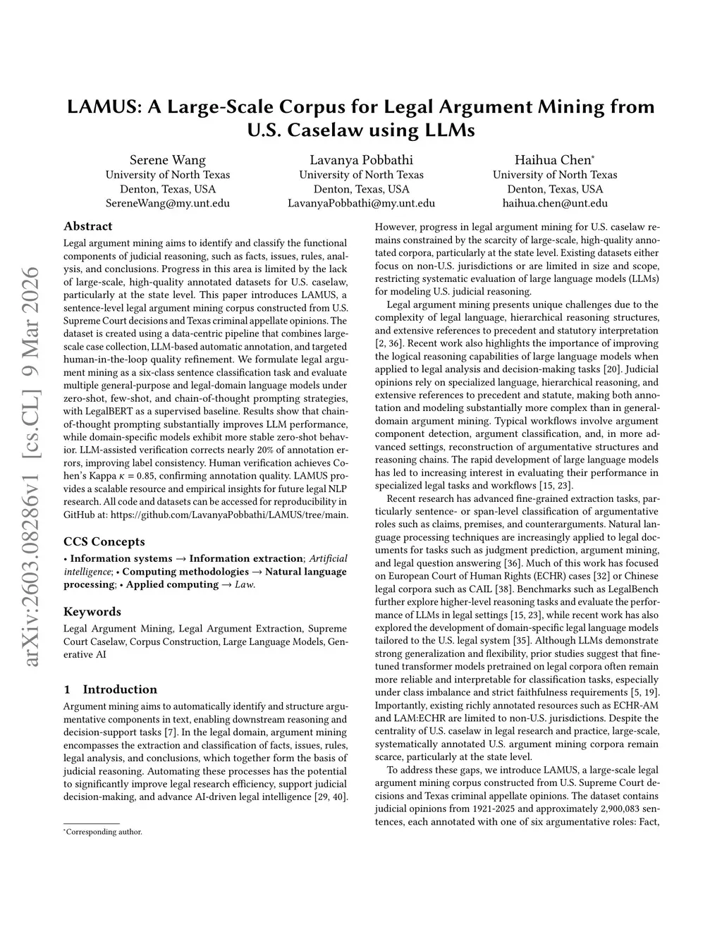 Legal argument mining aims to identify and classify the functional components of judicial reasoning, such as facts, issues, rules, analysis, and conclusions. Progress in this area is limited by the lack of large-scale, high-quality annotated datasets for U.S. caselaw, particularly at the state level. This paper introduces LAMUS, a sentence-level legal argument mining corpus constructed from U.S. Supreme Court decisions and Texas criminal appellate opinions. The dataset is created using a data-centric pipeline that combines large-scale case collection, LLM-based automatic annotation, and targeted human-in-the-loop quality refinement. We formulate legal argument mining as a six-class sentence classification task and evaluate multiple general-purpose and legal-domain language models under zero-shot, few-shot, and chain-of-thought prompting strategies, with LegalBERT as a supervised baseline. Results show that chain-of-thought prompting substantially improves LLM performance, while domain-specific models exhibit more stable zero-shot behavior. LLM-assisted verification corrects nearly 20% of annotation errors, improving label consistency. Human verification achieves Cohen's Kappa of 0.85, confirming annotation quality. LAMUS provides a scalable resource and empirical insights for future legal NLP research. All code and datasets can be accessed for reproducibility on GitHub at:this https URL