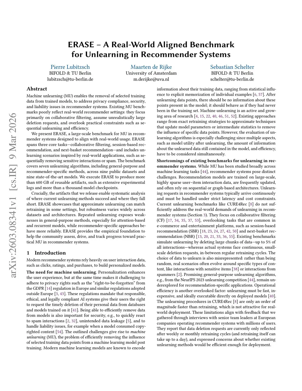 Machine unlearning (MU) enables the removal of selected training data from trained models, to address privacy compliance, security, and liability issues in recommender systems. Existing MU benchmarks poorly reflect real-world recommender settings: they focus primarily on collaborative filtering, assume unrealistically large deletion requests, and overlook practical constraints such as sequential unlearning and efficiency.We present ERASE, a large-scale benchmark for MU in recommender systems designed to align with real-world usage. ERASE spans three core tasks -- collaborative filtering, session-based recommendation, and next-basket recommendation -- and includes unlearning scenarios inspired by real-world applications, such as sequentially removing sensitive interactions or spam. The benchmark covers seven unlearning algorithms, including general-purpose and recommender-specific methods, across nine public datasets and nine state-of-the-art models. We execute ERASE to produce more than 600 GB of reusable artifacts, such as extensive experimental logs and more than a thousand model checkpoints.Crucially, the artifacts that we release enable systematic analysis of where current unlearning methods succeed and where they fall short. ERASE showcases that approximate unlearning can match retraining in some settings, but robustness varies widely across datasets and architectures. Repeated unlearning exposes weaknesses in general-purpose methods, especially for attention-based and recurrent models, while recommender-specific approaches behave more reliably. ERASE provides the empirical foundation to help the community assess, drive, and track progress toward practical MU in recommender systems.