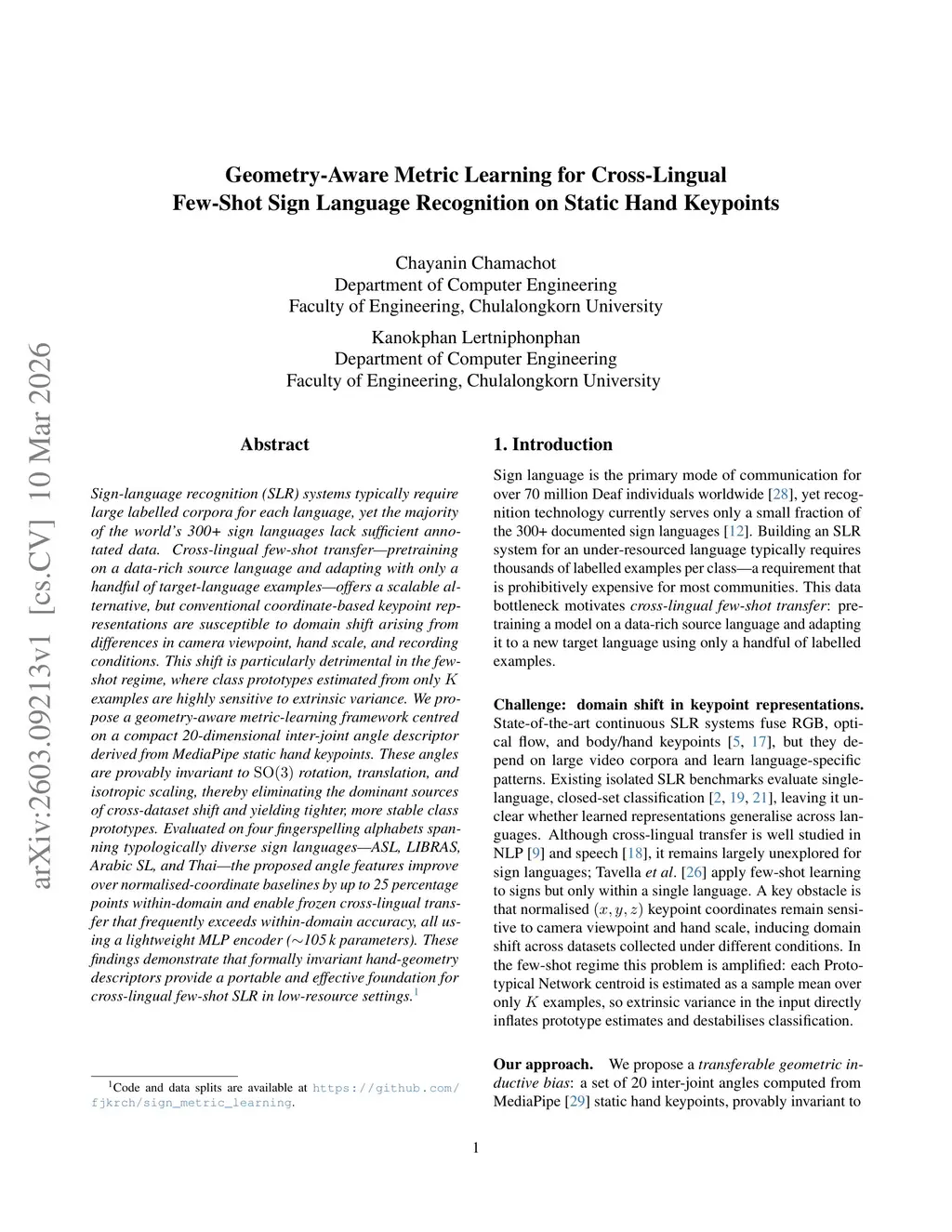 Sign language recognition (SLR) systems typically require large labeled corpora for each language, yet the majority of the world's 300+ sign languages lack sufficient annotated data. Cross-lingual few-shot transfer, pretraining on a data-rich source language and adapting with only a handful of target-language examples, offers a scalable alternative, but conventional coordinate-based keypoint representations are susceptible to domain shift arising from differences in camera viewpoint, hand scale, and recording conditions. This shift is particularly detrimental in the few-shot regime, where class prototypes estimated from only K examples are highly sensitive to extrinsic variance. We propose a geometry-aware metric-learning framework centered on a compact 20-dimensional inter-joint angle descriptor derived from MediaPipe static hand keypoints. These angles are invariant to SO(3) rotation, translation, and isotropic scaling, eliminating the dominant sources of cross-dataset shift and yielding tighter, more stable class prototypes. Evaluated on four fingerspelling alphabets spanning typologically diverse sign languages, ASL, LIBRAS, Arabic Sign Language, and Thai Sign Language, the proposed angle features improve over normalized-coordinate baselines by up to 25 percentage points within-domain and enable frozen cross-lingual transfer that frequently exceeds within-domain accuracy, using a lightweight MLP encoder with about 10^5 parameters. These findings demonstrate that invariant hand-geometry descriptors provide a portable and effective foundation for cross-lingual few-shot SLR in low-resource settings.