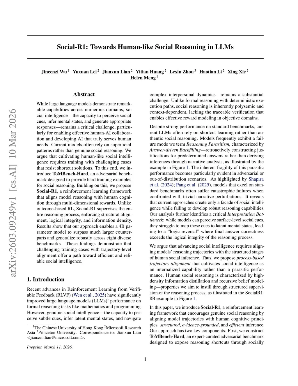 While large language models demonstrate remarkable capabilities across numerous domains, social intelligence - the capacity to perceive social cues, infer mental states, and generate appropriate responses - remains a critical challenge, particularly for enabling effective human-AI collaboration and developing AI that truly serves human needs. Current models often rely on superficial patterns rather than genuine social reasoning. We argue that cultivating human-like social intelligence requires training with challenging cases that resist shortcut solutions. To this end, we introduce ToMBench-Hard, an adversarial benchmark designed to provide hard training examples for social reasoning. Building on this, we propose Social-R1, a reinforcement learning framework that aligns model reasoning with human cognition through multi-dimensional rewards. Unlike outcome-based RL, Social-R1 supervises the entire reasoning process, enforcing structural alignment, logical integrity, and information density. Results show that our approach enables a 4B parameter model to surpass much larger counterparts and generalize robustly across eight diverse benchmarks. These findings demonstrate that challenging training cases with trajectory-level alignment offer a path toward efficient and reliable social intelligence.
