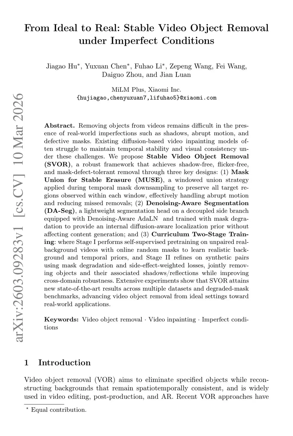 Removing objects from videos remains difficult in the presence of real-world imperfections such as shadows, abrupt motion, and defective masks. Existing diffusion-based video inpainting models often struggle to maintain temporal stability and visual consistency under these challenges. We propose Stable Video Object Removal (SVOR), a robust framework that achieves shadow-free, flicker-free, and mask-defect-tolerant removal through three key designs: (1) Mask Union for Stable Erasure (MUSE), a windowed union strategy applied during temporal mask downsampling to preserve all target regions observed within each window, effectively handling abrupt motion and reducing missed removals; (2) Denoising-Aware Segmentation (DA-Seg), a lightweight segmentation head on a decoupled side branch equipped with Denoising-Aware AdaLN and trained with mask degradation to provide an internal diffusion-aware localization prior without affecting content generation; and (3) Curriculum Two-Stage Training: where Stage I performs self-supervised pretraining on unpaired real-background videos with online random masks to learn realistic background and temporal priors, and Stage II refines on synthetic pairs using mask degradation and side-effect-weighted losses, jointly removing objects and their associated shadows/reflections while improving cross-domain robustness. Extensive experiments show that SVOR attains new state-of-the-art results across multiple datasets and degraded-mask benchmarks, advancing video object removal from ideal settings toward real-world applications.