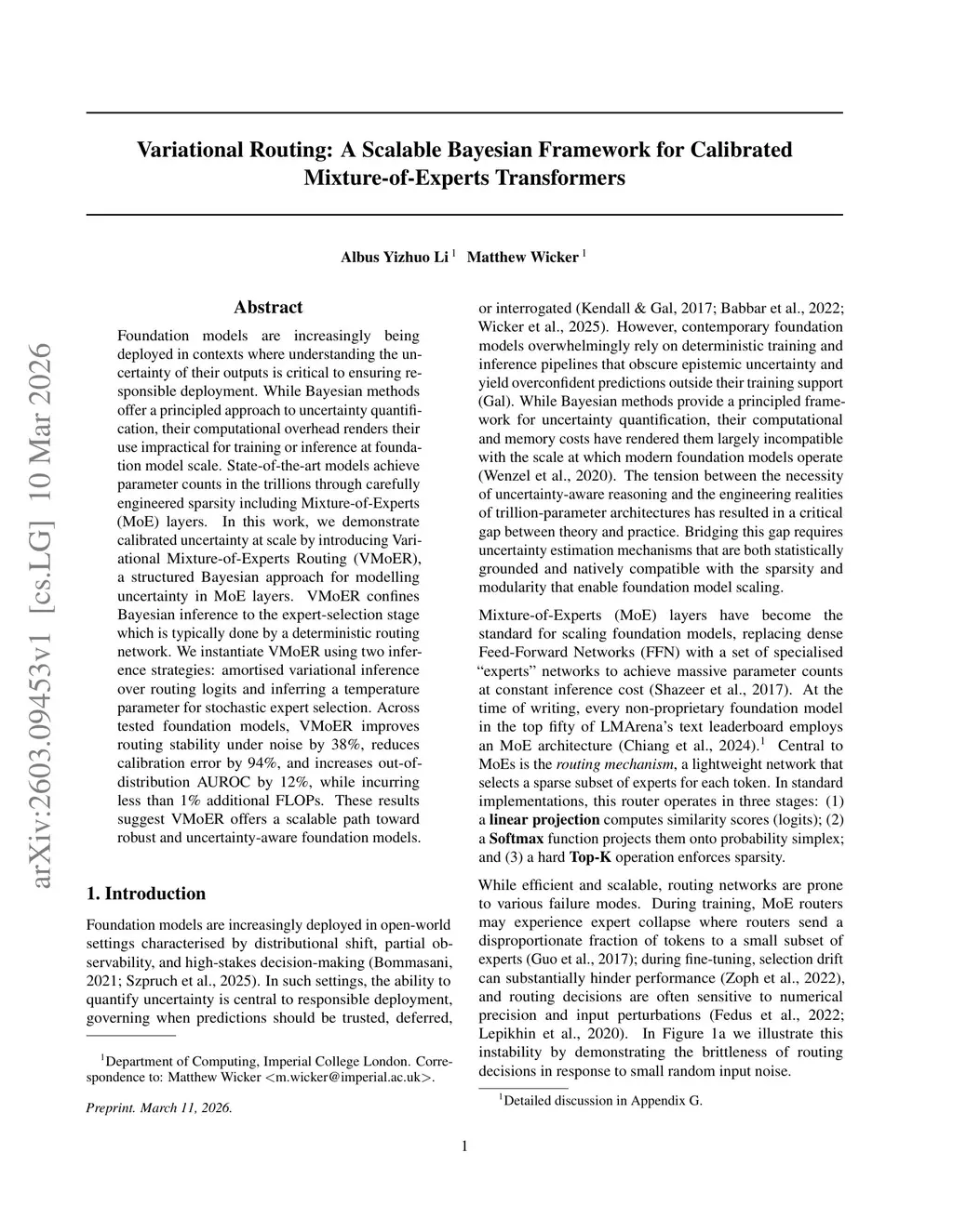 Foundation models are increasingly being deployed in contexts where understanding the uncertainty of their outputs is critical to ensuring responsible deployment. While Bayesian methods offer a principled approach to uncertainty quantification, their computational overhead renders their use impractical for training or inference at foundation model scale. State-of-the-art models achieve parameter counts in the trillions through carefully engineered sparsity including Mixture-of-Experts (MoE) layers. In this work, we demonstrate calibrated uncertainty at scale by introducing Variational Mixture-of-Experts Routing (VMoER), a structured Bayesian approach for modelling uncertainty in MoE layers. VMoER confines Bayesian inference to the expert-selection stage which is typically done by a deterministic routing network. We instantiate VMoER using two inference strategies: amortised variational inference over routing logits and inferring a temperature parameter for stochastic expert selection. Across tested foundation models, VMoER improves routing stability under noise by 38\%, reduces calibration error by 94\%, and increases out-of-distribution AUROC by 12\%, while incurring less than 1\% additional FLOPs. These results suggest VMoER offers a scalable path toward robust and uncertainty-aware foundation models.