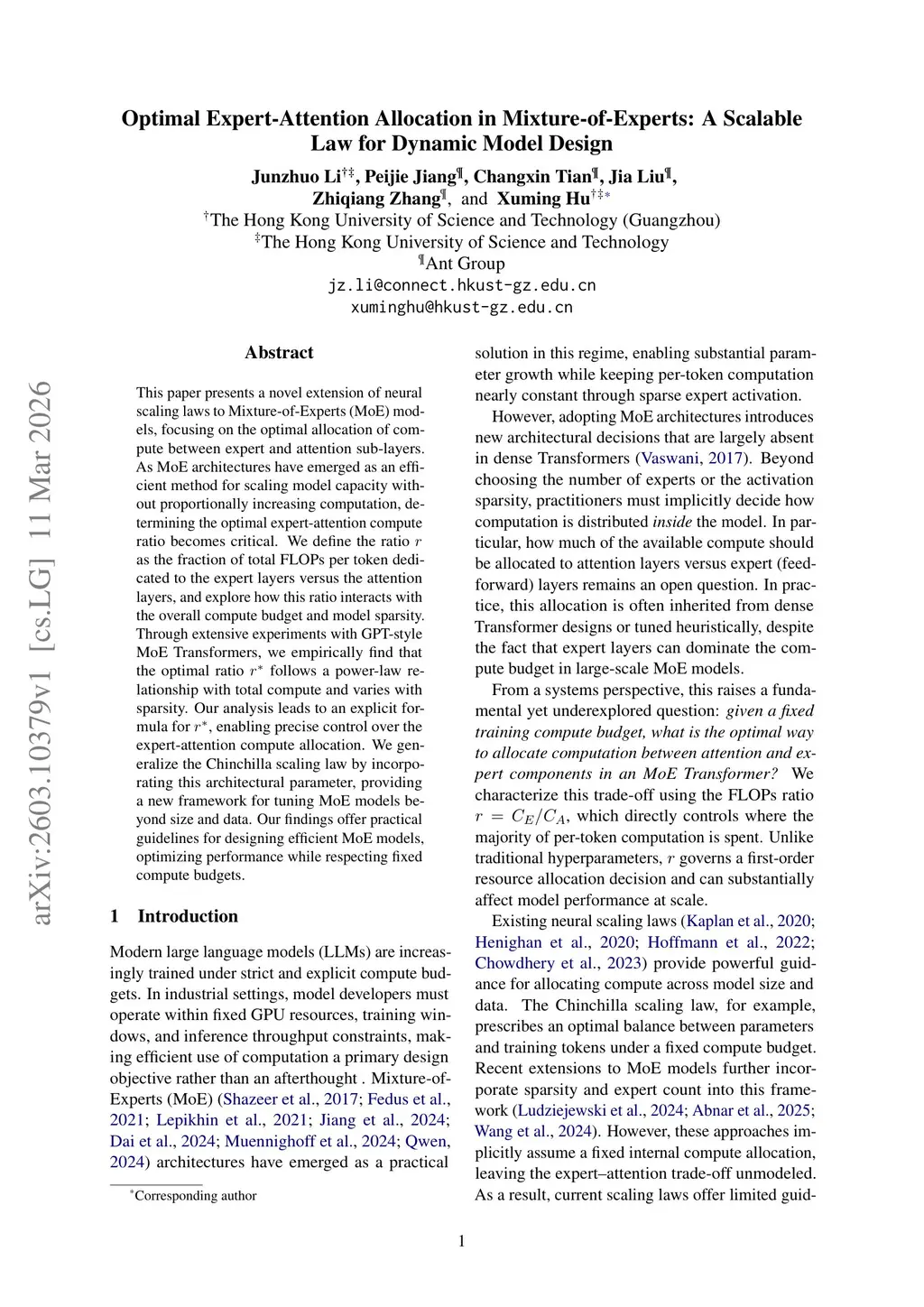 Optimal Expert-Attention Allocation in Mixture-of-Experts: A Scalable Law for Dynamic Model Design
