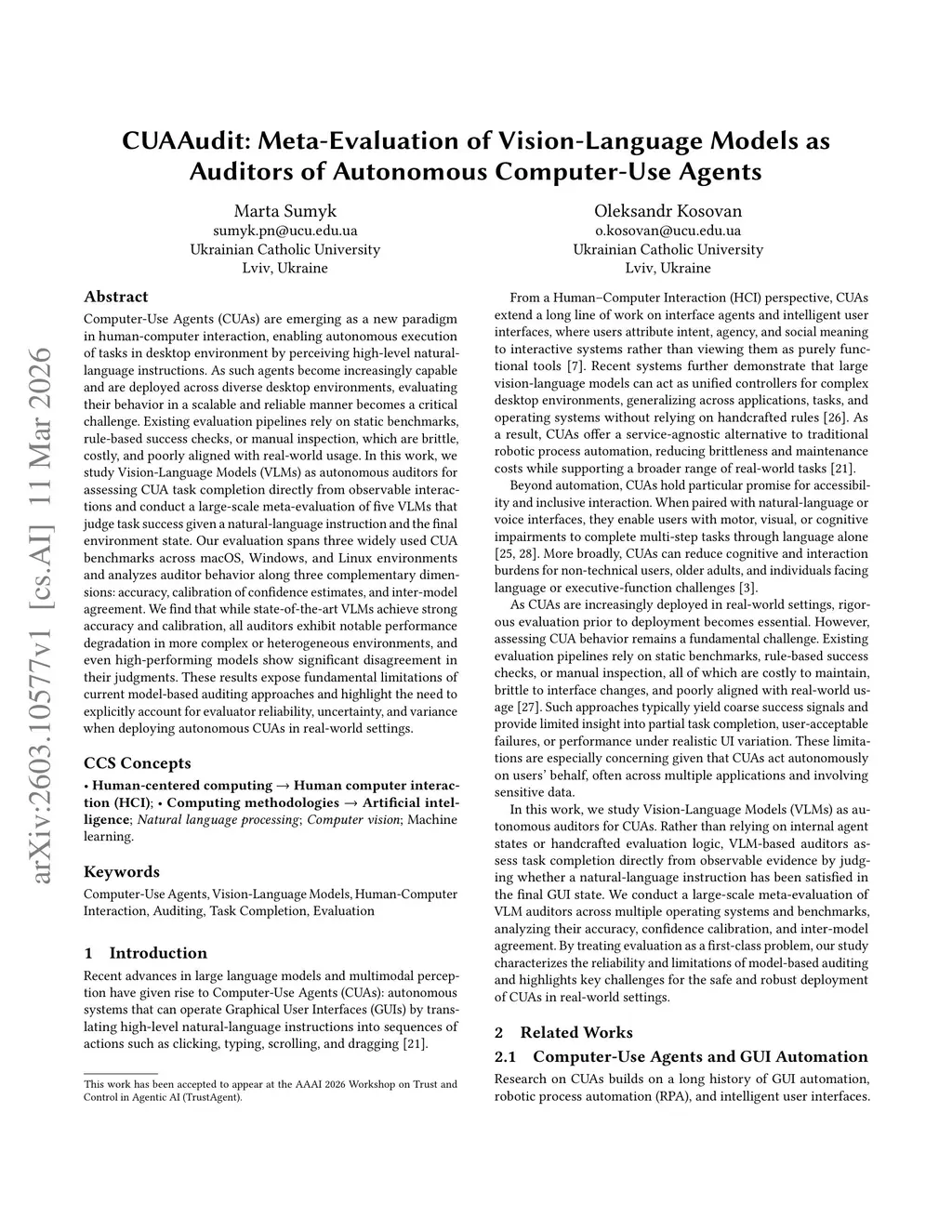 Computer-Use Agents (CUAs) are emerging as a new paradigm in human-computer interaction, enabling autonomous execution of tasks in desktop environment by perceiving high-level natural-language instructions. As such agents become increasingly capable and are deployed across diverse desktop environments, evaluating their behavior in a scalable and reliable manner becomes a critical challenge. Existing evaluation pipelines rely on static benchmarks, rule-based success checks, or manual inspection, which are brittle, costly, and poorly aligned with real-world usage. In this work, we study Vision-Language Models (VLMs) as autonomous auditors for assessing CUA task completion directly from observable interactions and conduct a large-scale meta-evaluation of five VLMs that judge task success given a natural-language instruction and the final environment state. Our evaluation spans three widely used CUA benchmarks across macOS, Windows, and Linux environments and analyzes auditor behavior along three complementary dimensions: accuracy, calibration of confidence estimates, and inter-model agreement. We find that while state-of-the-art VLMs achieve strong accuracy and calibration, all auditors exhibit notable performance degradation in more complex or heterogeneous environments, and even high-performing models show significant disagreement in their judgments. These results expose fundamental limitations of current model-based auditing approaches and highlight the need to explicitly account for evaluator reliability, uncertainty, and variance when deploying autonomous CUAs in real-world settings.