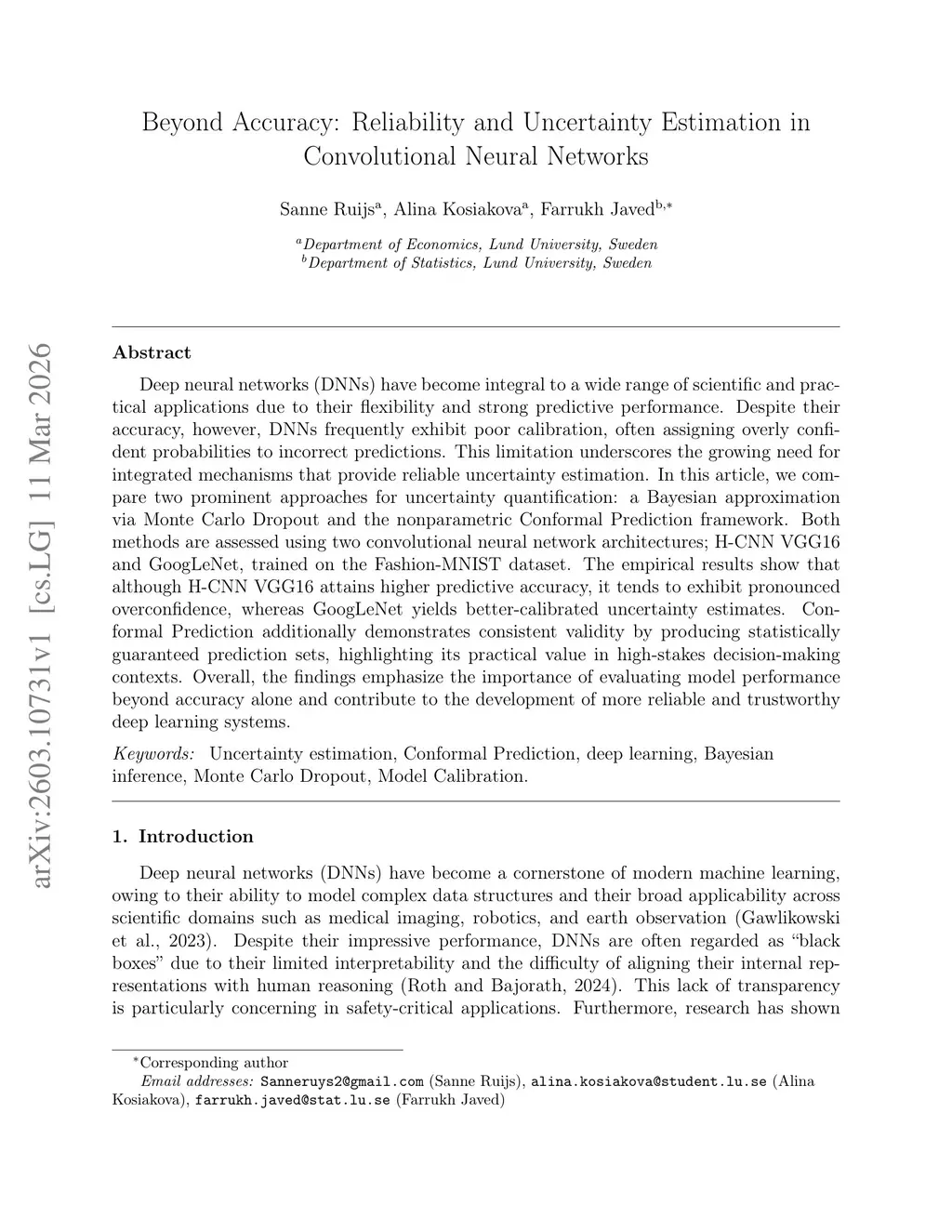 Deep neural networks (DNNs) have become integral to a wide range of scientific and practical applications due to their flexibility and strong predictive performance. Despite their accuracy, however, DNNs frequently exhibit poor calibration, often assigning overly confident probabilities to incorrect predictions. This limitation underscores the growing need for integrated mechanisms that provide reliable uncertainty estimation. In this article, we compare two prominent approaches for uncertainty quantification: a Bayesian approximation via Monte Carlo Dropout and the nonparametric Conformal Prediction framework. Both methods are assessed using two convolutional neural network architectures; H-CNN VGG16 and GoogLeNet, trained on the Fashion-MNIST dataset. The empirical results show that although H-CNN VGG16 attains higher predictive accuracy, it tends to exhibit pronounced overconfidence, whereas GoogLeNet yields better-calibrated uncertainty estimates. Conformal Prediction additionally demonstrates consistent validity by producing statistically guaranteed prediction sets, highlighting its practical value in high-stakes decision-making contexts. Overall, the findings emphasize the importance of evaluating model performance beyond accuracy alone and contribute to the development of more reliable and trustworthy deep learning systems.