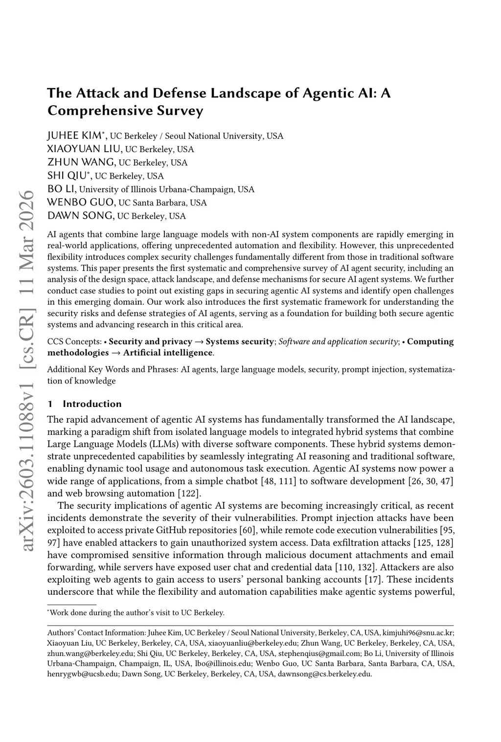 AI agents that combine large language models with non-AI system components are rapidly emerging in real-world applications, offering unprecedented automation and flexibility. However, this unprecedented flexibility introduces complex security challenges fundamentally different from those in traditional software systems. This paper presents the first systematic and comprehensive survey of AI agent security, including an analysis of the design space, attack landscape, and defense mechanisms for secure AI agent systems. We further conduct case studies to point out existing gaps in securing agentic AI systems and identify open challenges in this emerging domain. Our work also introduces the first systematic framework for understanding the security risks and defense strategies of AI agents, serving as a foundation for building both secure agentic systems and advancing research in this critical area.
