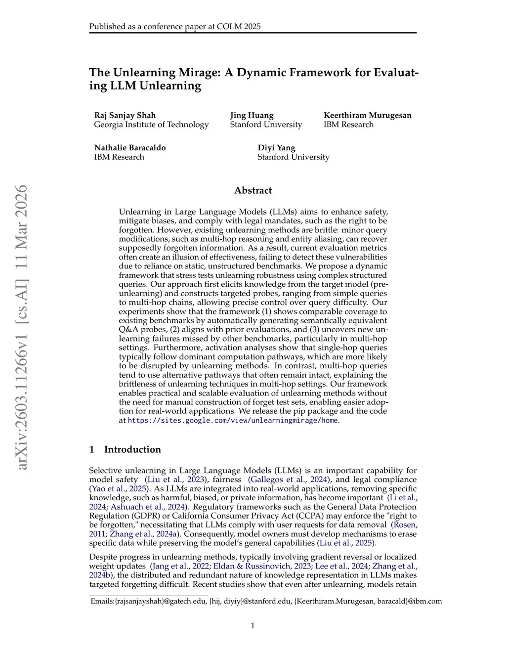 Unlearning in Large Language Models (LLMs) aims to enhance safety, mitigate biases, and comply with legal mandates, such as the right to be forgotten. However, existing unlearning methods are brittle: minor query modifications, such as multi-hop reasoning and entity aliasing, can recover supposedly forgotten information. As a result, current evaluation metrics often create an illusion of effectiveness, failing to detect these vulnerabilities due to reliance on static, unstructured benchmarks. We propose a dynamic framework that stress tests unlearning robustness using complex structured queries. Our approach first elicits knowledge from the target model (pre-unlearning) and constructs targeted probes, ranging from simple queries to multi-hop chains, allowing precise control over query difficulty. Our experiments show that the framework (1) shows comparable coverage to existing benchmarks by automatically generating semantically equivalent Q&A probes, (2) aligns with prior evaluations, and (3) uncovers new unlearning failures missed by other benchmarks, particularly in multi-hop settings. Furthermore, activation analyses show that single-hop queries typically follow dominant computation pathways, which are more likely to be disrupted by unlearning methods. In contrast, multi-hop queries tend to use alternative pathways that often remain intact, explaining the brittleness of unlearning techniques in multi-hop settings. Our framework enables practical and scalable evaluation of unlearning methods without the need for manual construction of forget test sets, enabling easier adoption for real-world applications. We release the pip package and the code atthis https URL.