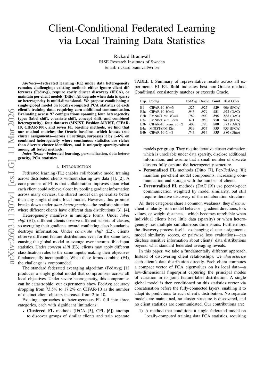 Federated learning (FL) under data heterogeneity remains challenging: existing methods either ignore client differences (FedAvg), require costly cluster discovery (IFCA), or maintain per-client models (Ditto). All degrade when data is sparse or heterogeneity is multi-dimensional. We propose conditioning a single global model on locally-computed PCA statistics of each client's training data, requiring zero additional communication. Evaluating across 97~configurations spanning four heterogeneity types (label shift, covariate shift, concept shift, and combined heterogeneity), four datasets (MNIST, Fashion-MNIST, CIFAR-10, CIFAR-100), and seven FL baseline methods, we find that our method matches the Oracle baseline -- which knows true cluster assignments -- across all settings, surpasses it by 1--6% on combined heterogeneity where continuous statistics are richer than discrete cluster identifiers, and is uniquely sparsity-robust among all tested methods.
