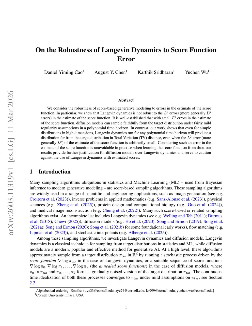 We consider the robustness of score-based generative modeling to errors in the estimate of the score function. In particular, we show that Langevin dynamics is not robust to the L^2 errors (more generally L^p errors) in the estimate of the score function. It is well-established that with small L^2 errors in the estimate of the score function, diffusion models can sample faithfully from the target distribution under fairly mild regularity assumptions in a polynomial time horizon. In contrast, our work shows that even for simple distributions in high dimensions, Langevin dynamics run for any polynomial time horizon will produce a distribution far from the target distribution in Total Variation (TV) distance, even when the L^2 error (more generally L^p) of the estimate of the score function is arbitrarily small. Considering such an error in the estimate of the score function is unavoidable in practice when learning the score function from data, our results provide further justification for diffusion models over Langevin dynamics and serve to caution against the use of Langevin dynamics with estimated scores.