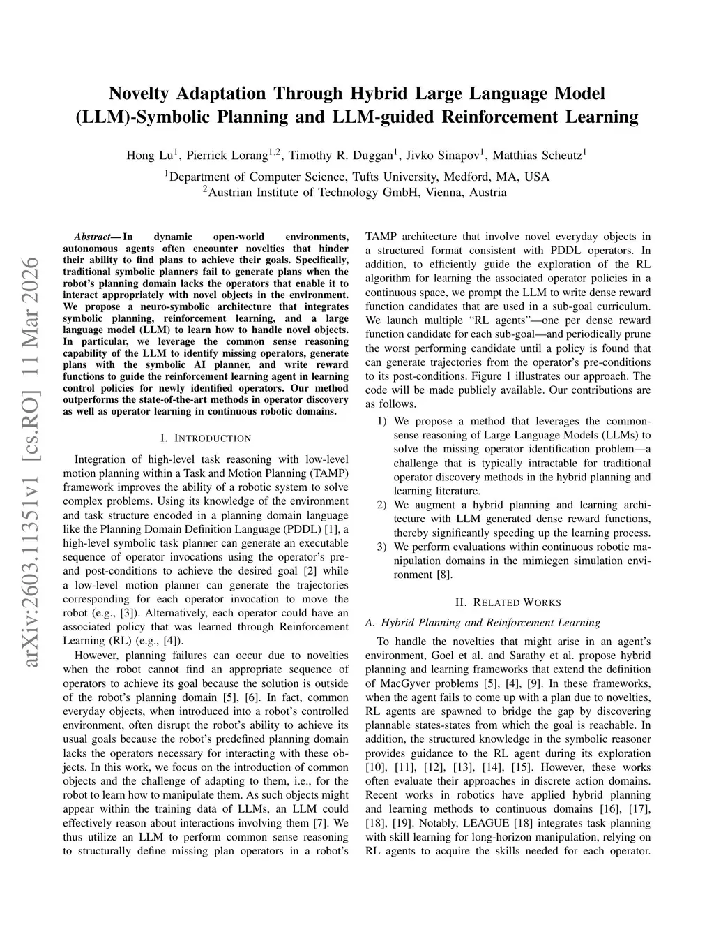 In dynamic open-world environments, autonomous agents often encounter novelties that hinder their ability to find plans to achieve their goals. Specifically, traditional symbolic planners fail to generate plans when the robot's planning domain lacks the operators that enable it to interact appropriately with novel objects in the environment. We propose a neuro-symbolic architecture that integrates symbolic planning, reinforcement learning, and a large language model (LLM) to learn how to handle novel objects. In particular, we leverage the common sense reasoning capability of the LLM to identify missing operators, generate plans with the symbolic AI planner, and write reward functions to guide the reinforcement learning agent in learning control policies for newly identified operators. Our method outperforms the state-of-the-art methods in operator discovery as well as operator learning in continuous robotic domains.