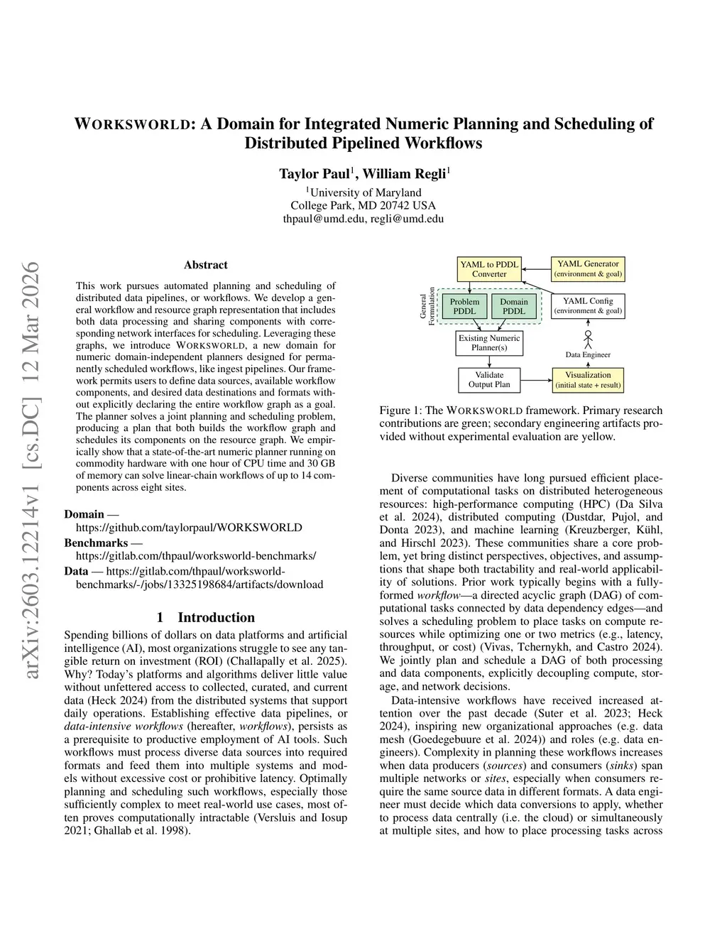 This work pursues automated planning and scheduling of distributed data pipelines, or workflows. We develop a general workflow and resource graph representation that includes both data processing and sharing components with corresponding network interfaces for scheduling. Leveraging these graphs, we introduce WORKSWORLD, a new domain for numeric domain-independent planners designed for permanently scheduled workflows, like ingest pipelines. Our framework permits users to define data sources, available workflow components, and desired data destinations and formats without explicitly declaring the entire workflow graph as a goal. The planner solves a joint planning and scheduling problem, producing a plan that both builds the workflow graph and schedules its components on the resource graph. We empirically show that a state-of-the-art numeric planner running on commodity hardware with one hour of CPU time and 30GB of memory can solve linear-chain workflows of up to 14 components across eight sites.
