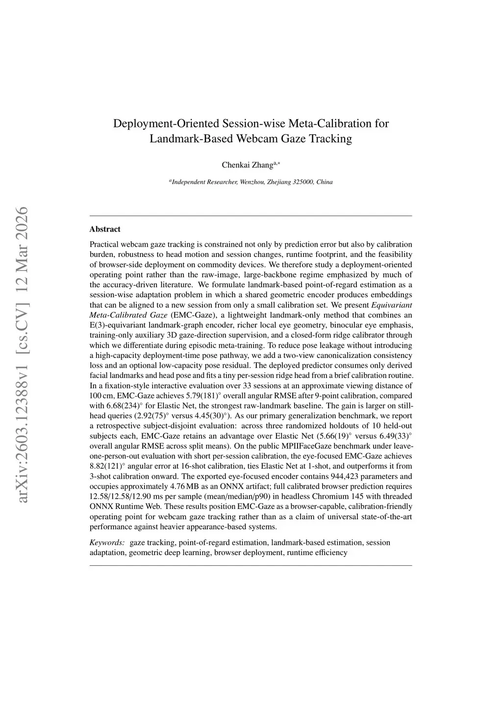 Practical webcam gaze tracking is constrained not only by error, but also by calibration burden, robustness to head motion and session drift, runtime footprint, and browser use. We therefore target a deployment-oriented operating point rather than the image large-backbone regime. We cast landmark-based point-of-regard estimation as session-wise adaptation: a shared geometric encoder produces embeddings that can be aligned to a new session from a small calibration set. We present Equivariant Meta-Calibrated Gaze (EMC-Gaze), a lightweight landmark-only method combining an E(3)-equivariant landmark-graph encoder, local eye geometry, binocular emphasis, auxiliary 3D gaze-direction supervision, and a closed-form ridge calibrator differentiated through episodic meta-training. To reduce pose leakage, we use a two-view canonicalization consistency loss. The deployed predictor uses only facial landmarks and fits a per-session ridge head from brief calibration. In a fixation-style interactive evaluation over 33 sessions at 100 cm, EMC-Gaze achieves 5.79 +/- 1.81 deg RMSE after 9-point calibration versus 6.68 +/- 2.34 deg for Elastic Net; the gain is larger on still-head queries (2.92 +/- 0.75 deg vs. 4.45 +/- 0.30 deg). Across three subject holdouts of 10 subjects each, EMC-Gaze retains an advantage (5.66 +/- 0.19 deg vs. 6.49 +/- 0.33 deg). On MPIIFaceGaze with short per-session calibration, the eye-focused model reaches 8.82 +/- 1.21 deg at 16-shot calibration, ties Elastic Net at 1-shot, and outperforms it from 3-shot onward. The exported eye-focused encoder has 944,423 parameters, is 4.76 MB in ONNX, and supports calibrated browser prediction in 12.58/12.58/12.90 ms per sample (mean/median/p90) in Chromium 145 with ONNX Runtime Web. These results position EMC-Gaze as a calibration-friendly operating point rather than a universal state-of-the-art claim against heavier appearance-based systems.