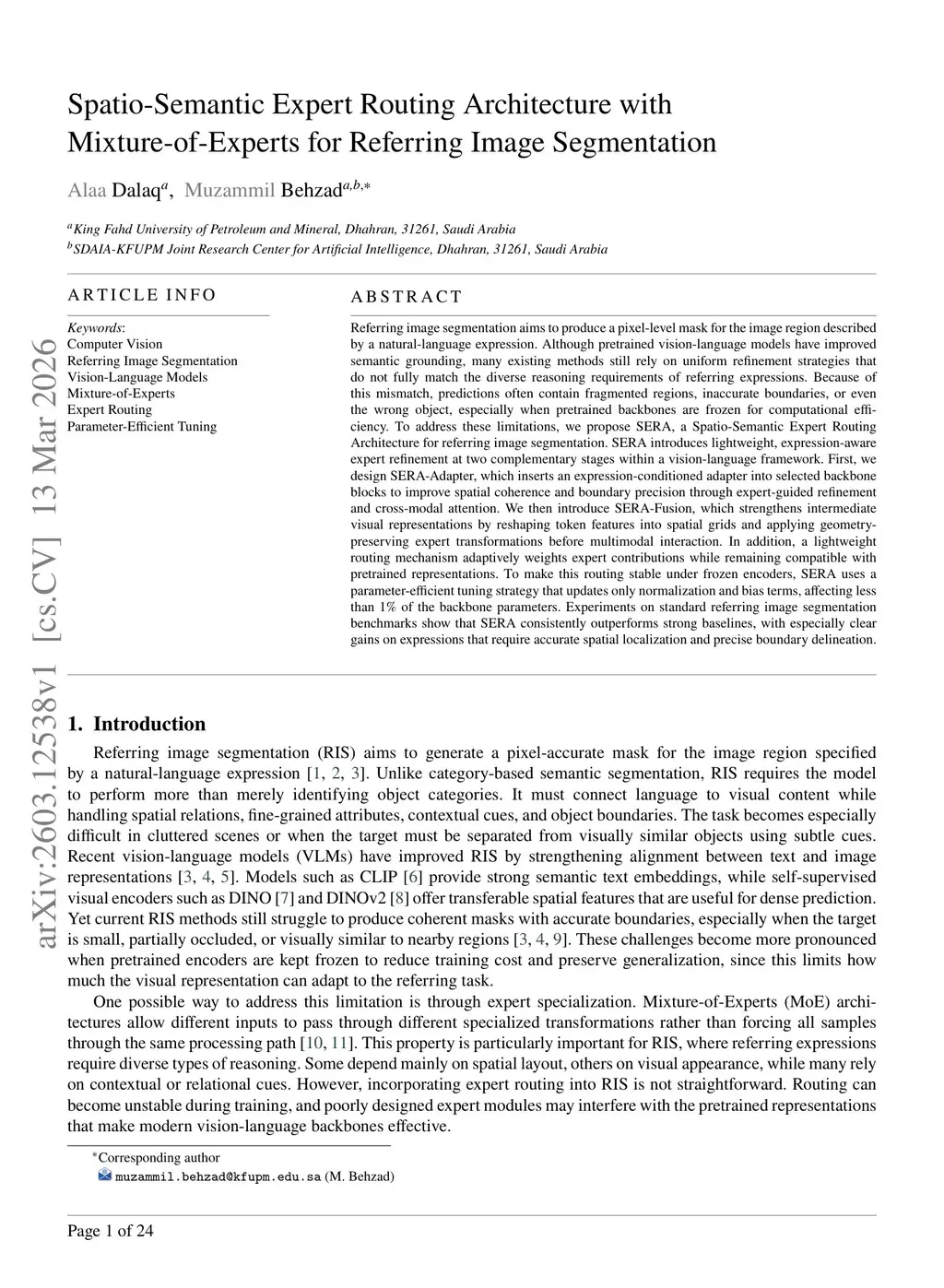 Referring image segmentation aims to produce a pixel-level mask for the image region described by a natural-language expression. Although pretrained vision-language models have improved semantic grounding, many existing methods still rely on uniform refinement strategies that do not fully match the diverse reasoning requirements of referring expressions. Because of this mismatch, predictions often contain fragmented regions, inaccurate boundaries, or even the wrong object, especially when pretrained backbones are frozen for computational efficiency. To address these limitations, we propose SERA, a Spatio-Semantic Expert Routing Architecture for referring image segmentation. SERA introduces lightweight, expression-aware expert refinement at two complementary stages within a vision-language framework. First, we design SERA-Adapter, which inserts an expression-conditioned adapter into selected backbone blocks to improve spatial coherence and boundary precision through expert-guided refinement and cross-modal attention. We then introduce SERA-Fusion, which strengthens intermediate visual representations by reshaping token features into spatial grids and applying geometry-preserving expert transformations before multimodal interaction. In addition, a lightweight routing mechanism adaptively weights expert contributions while remaining compatible with pretrained representations. To make this routing stable under frozen encoders, SERA uses a parameter-efficient tuning strategy that updates only normalization and bias terms, affecting less than 1% of the backbone parameters. Experiments on standard referring image segmentation benchmarks show that SERA consistently outperforms strong baselines, with especially clear gains on expressions that require accurate spatial localization and precise boundary delineation.