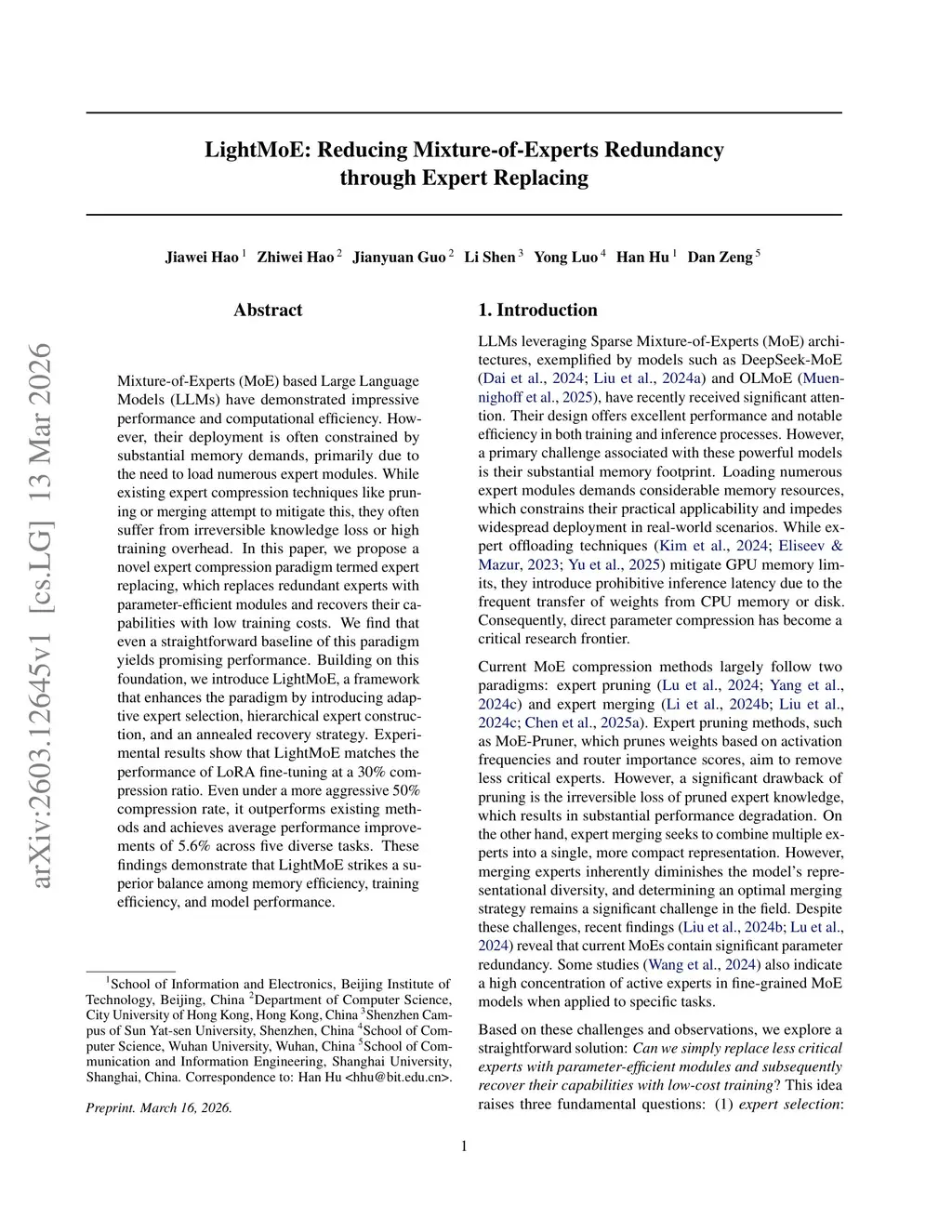 Mixture-of-Experts (MoE) based Large Language Models (LLMs) have demonstrated impressive performance and computational efficiency. However, their deployment is often constrained by substantial memory demands, primarily due to the need to load numerous expert modules. While existing expert compression techniques like pruning or merging attempt to mitigate this, they often suffer from irreversible knowledge loss or high training overhead. In this paper, we propose a novel expert compression paradigm termed expert replacing, which replaces redundant experts with parameter-efficient modules and recovers their capabilities with low training costs. We find that even a straightforward baseline of this paradigm yields promising performance. Building on this foundation, we introduce LightMoE, a framework that enhances the paradigm by introducing adaptive expert selection, hierarchical expert construction, and an annealed recovery strategy. Experimental results show that LightMoE matches the performance of LoRA fine-tuning at a 30% compression ratio. Even under a more aggressive 50% compression rate, it outperforms existing methods and achieves average performance improvements of 5.6% across five diverse tasks. These findings demonstrate that LightMoE strikes a superior balance among memory efficiency, training efficiency, and model performance.
