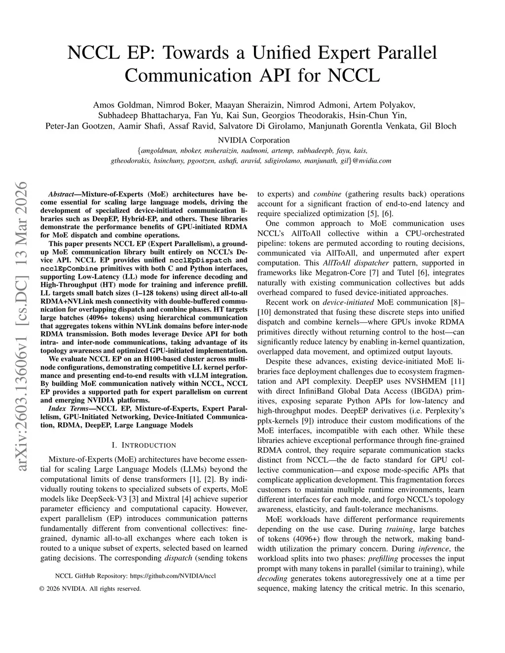 Mixture-of-Experts (MoE) architectures have become essential for scaling large language models, driving the development of specialized device-initiated communication libraries such as DeepEP, Hybrid-EP, and others. These libraries demonstrate the performance benefits of GPU-initiated RDMA for MoE dispatch and combine operations.This paper presents NCCL EP (Expert Parallelism), a ground-up MoE communication library built entirely on NCCL's Device API. NCCL EP provides unified ncclEpDispatch and ncclEpCombine primitives with both C and Python interfaces, supporting Low-Latency (LL) mode for inference decoding and High-Throughput (HT) mode for training and inference prefill. LL targets small batch sizes (1-128 tokens) using direct all-to-all RDMA+NVLink mesh connectivity with double-buffered communication for overlapping dispatch and combine phases. HT targets large batches (4096+ tokens) using hierarchical communication that aggregates tokens within NVLink domains before inter-node RDMA transmission. Both modes leverage Device API for both intra- and inter-node communications, taking advantage of its topology awareness and optimized GPU-initiated implementation.We evaluate NCCL EP on an H100-based cluster across multi-node configurations, demonstrating competitive LL kernel performance and presenting end-to-end results with vLLM integration. By building MoE communication natively within NCCL, NCCL EP provides a supported path for expert parallelism on current and emerging NVIDIA platforms.