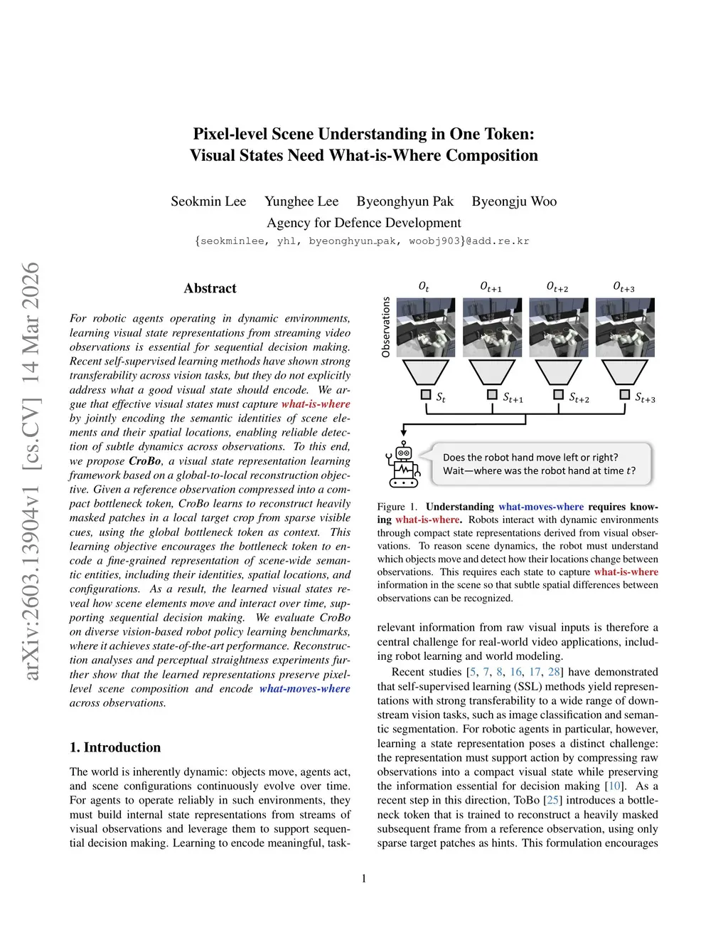 For robotic agents operating in dynamic environments, learning visual state representations from streaming video observations is essential for sequential decision making. Recent self-supervised learning methods have shown strong transferability across vision tasks, but they do not explicitly address what a good visual state should encode. We argue that effective visual states must capture what-is-where by jointly encoding the semantic identities of scene elements and their spatial locations, enabling reliable detection of subtle dynamics across observations. To this end, we propose CroBo, a visual state representation learning framework based on a global-to-local reconstruction objective. Given a reference observation compressed into a compact bottleneck token, CroBo learns to reconstruct heavily masked patches in a local target crop from sparse visible cues, using the global bottleneck token as context. This learning objective encourages the bottleneck token to encode a fine-grained representation of scene-wide semantic entities, including their identities, spatial locations, and configurations. As a result, the learned visual states reveal how scene elements move and interact over time, supporting sequential decision making. We evaluate CroBo on diverse vision-based robot policy learning benchmarks, where it achieves state-of-the-art performance. Reconstruction analyses and perceptual straightness experiments further show that the learned representations preserve pixel-level scene composition and encode what-moves-where across observations.