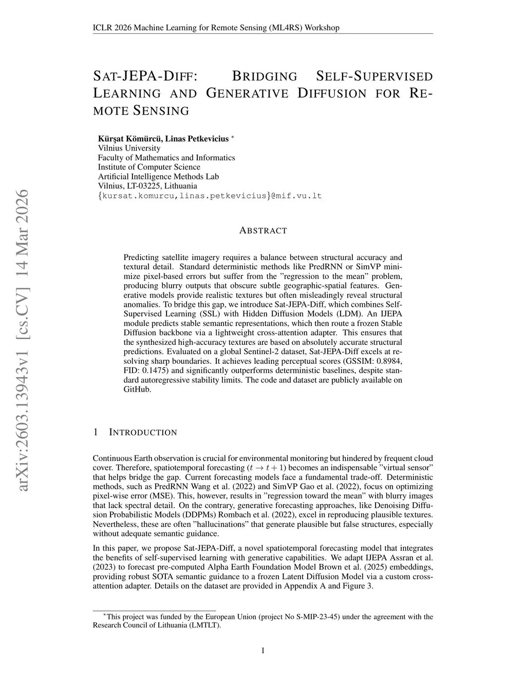 Predicting satellite imagery requires a balance between structural accuracy and textural detail. Standard deterministic methods like PredRNN or SimVP minimize pixel-based errors but suffer from the "regression to the mean" problem, producing blurry outputs that obscure subtle geographic-spatial features. Generative models provide realistic textures but often misleadingly reveal structural anomalies. To bridge this gap, we introduce Sat-JEPA-Diff, which combines Self-Supervised Learning (SSL) with Hidden Diffusion Models (LDM). An IJEPA module predicts stable semantic representations, which then route a frozen Stable Diffusion backbone via a lightweight cross-attention adapter. This ensures that the synthesized high-accuracy textures are based on absolutely accurate structural predictions. Evaluated on a global Sentinel-2 dataset, Sat-JEPA-Diff excels at resolving sharp boundaries. It achieves leading perceptual scores (GSSIM: 0.8984, FID: 0.1475) and significantly outperforms deterministic baselines, despite standard autoregressive stability limits. The code and dataset are publicly available onthis https URL.