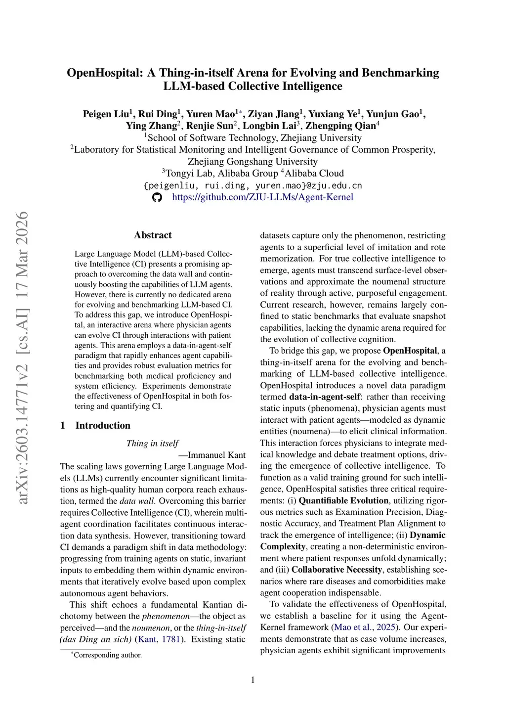 OpenHospital: A Thing-in-itself Arena for Evolving and Benchmarking LLM-based Collective Intelligence