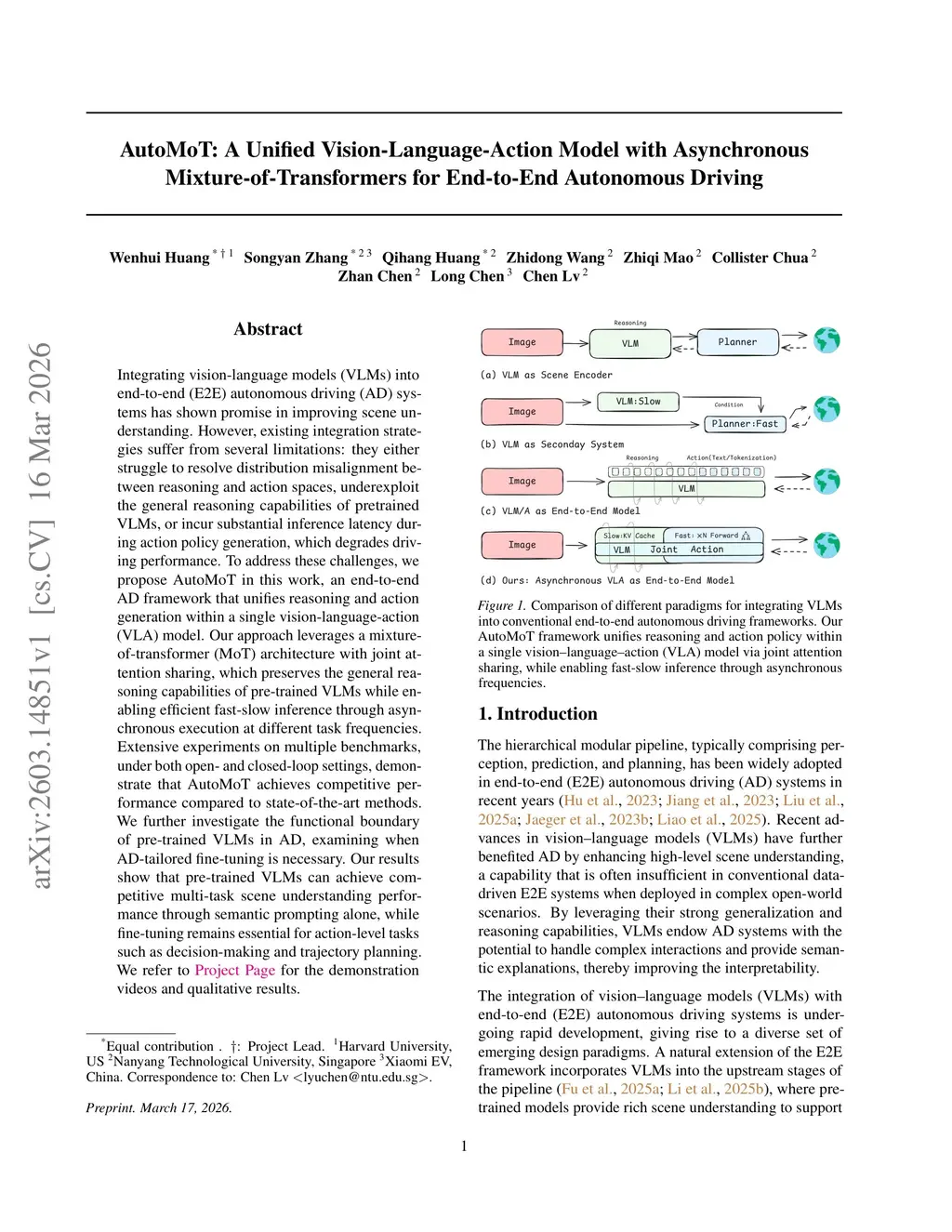 AutoMoT: A Unified Vision-Language-Action Model with Asynchronous Mixture-of-Transformers for End-to-End Autonomous Driving