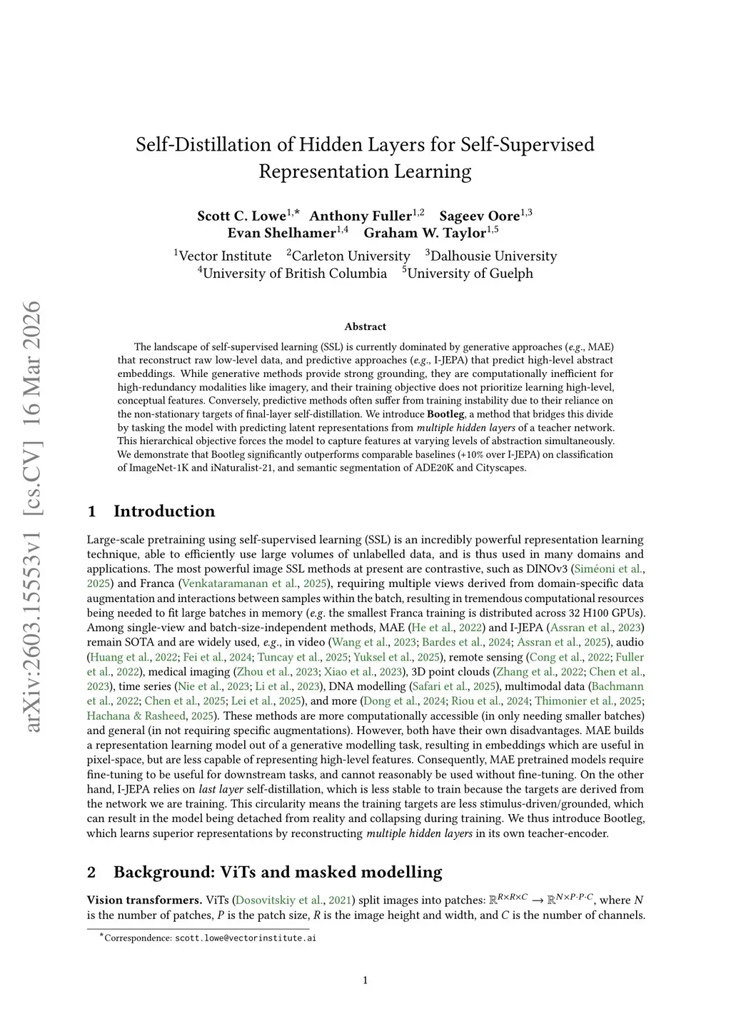The landscape of self-supervised learning (SSL) is currently dominated by generative approaches (e.g., MAE) that reconstruct raw low-level data, and predictive approaches (e.g., I-JEPA) that predict high-level abstract embeddings. While generative methods provide strong grounding, they are computationally inefficient for high-redundancy modalities like imagery, and their training objective does not prioritize learning high-level, conceptual features. Conversely, predictive methods often suffer from training instability due to their reliance on the non-stationary targets of final-layer self-distillation. We introduce Bootleg, a method that bridges this divide by tasking the model with predicting latent representations from multiple hidden layers of a teacher network. This hierarchical objective forces the model to capture features at varying levels of abstraction simultaneously. We demonstrate that Bootleg significantly outperforms comparable baselines (+10% over I-JEPA) on classification of ImageNet-1K and iNaturalist-21, and semantic segmentation of ADE20K and Cityscapes.
