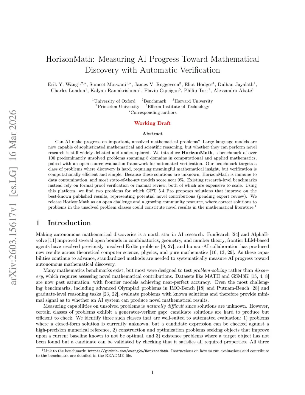 Can AI make progress on important, unsolved mathematical problems? Large language models are now capable of sophisticated mathematical and scientific reasoning, but whether they can perform novel research is still widely debated and underexplored. We introduce HorizonMath, a benchmark of over 100 predominantly unsolved problems spanning 8 domains in computational and applied mathematics, paired with an open-source evaluation framework for automated verification. Our benchmark targets a class of problems where discovery is hard, requiring meaningful mathematical insight, but verification is computationally efficient and simple. Because these solutions are unknown, HorizonMath is immune to data contamination, and most state-of-the-art models score near 0%. Existing research-level benchmarks instead rely on formal proof verification or manual review, both of which are expensive to scale. Using this platform, we find two problems for which GPT 5.4 Pro proposes solutions that improve on the best-known published results, representing potential novel contributions (pending expert review). We release HorizonMath as an open challenge and a growing community resource, where correct solutions to problems in the unsolved problem classes could constitute novel results in the mathematical literature.