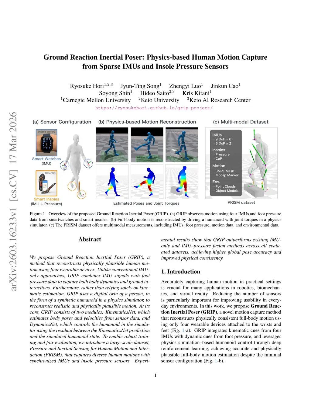 We propose Ground Reaction Inertial Poser (GRIP), a method that reconstructs physically plausible human motion using four wearable devices. Unlike conventional IMU-only approaches, GRIP combines IMU signals with foot pressure data to capture both body dynamics and ground interactions. Furthermore, rather than relying solely on kinematic estimation, GRIP uses a digital twin of a person, in the form of a synthetic humanoid in a physics simulator, to reconstruct realistic and physically plausible motion. At its core, GRIP consists of two modules: KinematicsNet, which estimates body poses and velocities from sensor data, and DynamicsNet, which controls the humanoid in the simulator using the residual between the KinematicsNet prediction and the simulated humanoid state. To enable robust training and fair evaluation, we introduce a large-scale dataset, Pressure and Inertial Sensing for Human Motion and Interaction (PRISM), that captures diverse human motions with synchronized IMUs and insole pressure sensors. Experimental results show that GRIP outperforms existing IMU-only and IMU-pressure fusion methods across all evaluated datasets, achieving higher global pose accuracy and improved physical consistency.