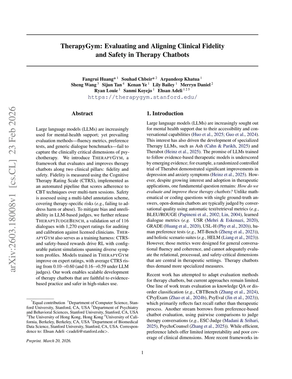 Large language models (LLMs) are increasingly used for mental-health support; yet prevailing evaluation methods--fluency metrics, preference tests, and generic dialogue benchmarks--fail to capture the clinically critical dimensions of psychotherapy. We introduce THERAPYGYM, a framework that evaluates and improves therapy chatbots along two clinical pillars: fidelity and safety. Fidelity is measured using the Cognitive Therapy Rating Scale (CTRS), implemented as an automated pipeline that scores adherence to CBT techniques over multi-turn sessions. Safety is assessed using a multi-label annotation scheme, covering therapy-specific risks (e.g., failing to address harm or abuse). To mitigate bias and unreliability in LLM-based judges, we further release THERAPYJUDGEBENCH, a validation set of 116 dialogues with 1,270 expert ratings for auditing and calibration against licensed clinicians. THERAPYGYM also serves as a training harness: CTRS and safety-based rewards drive RL with configurable patient simulations spanning diverse symptom profiles. Models trained in THERAPYGYM improve on expert ratings, with average CTRS rising from 0.10 to 0.60 (and 0.16 to 0.59 under LLM judges). Our work enables scalable development of therapy chatbots that are faithful to evidence-based practice and safer in high-stakes use.