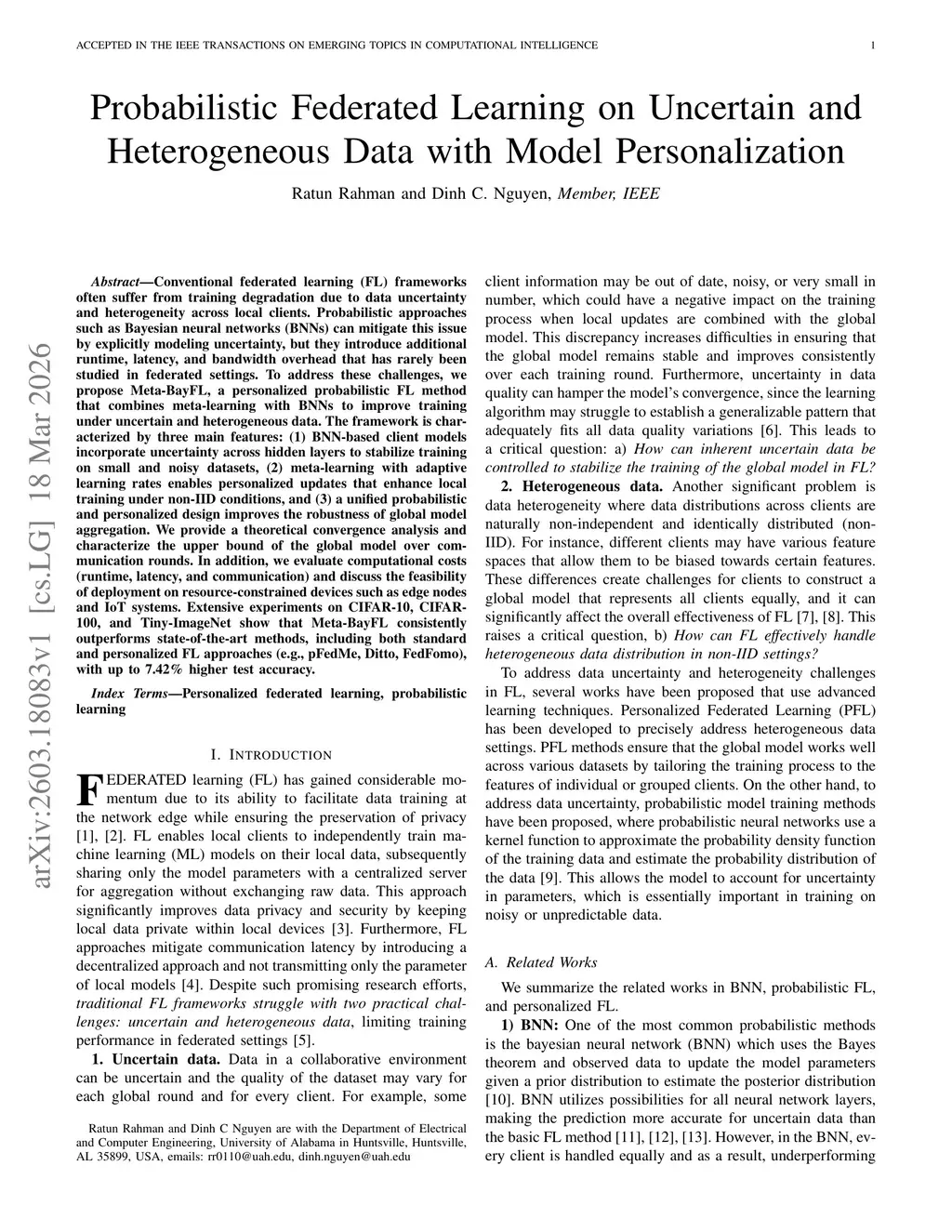 Conventional federated learning (FL) frameworks often suffer from training degradation due to data uncertainty and heterogeneity across local clients. Probabilistic approaches such as Bayesian neural networks (BNNs) can mitigate this issue by explicitly modeling uncertainty, but they introduce additional runtime, latency, and bandwidth overhead that has rarely been studied in federated settings. To address these challenges, we propose Meta-BayFL, a personalized probabilistic FL method that combines meta-learning with BNNs to improve training under uncertain and heterogeneous data. The framework is characterized by three main features: (1) BNN-based client models incorporate uncertainty across hidden layers to stabilize training on small and noisy datasets, (2) meta-learning with adaptive learning rates enables personalized updates that enhance local training under non-IID conditions, and (3) a unified probabilistic and personalized design improves the robustness of global model aggregation. We provide a theoretical convergence analysis and characterize the upper bound of the global model over communication rounds. In addition, we evaluate computational costs (runtime, latency, and communication) and discuss the feasibility of deployment on resource-constrained devices such as edge nodes and IoT systems. Extensive experiments on CIFAR-10, CIFAR-100, and Tiny-ImageNet show that Meta-BayFL consistently outperforms state-of-the-art methods, including both standard and personalized FL approaches (e.g., pFedMe, Ditto, FedFomo), with up to 7.42\% higher test accuracy.