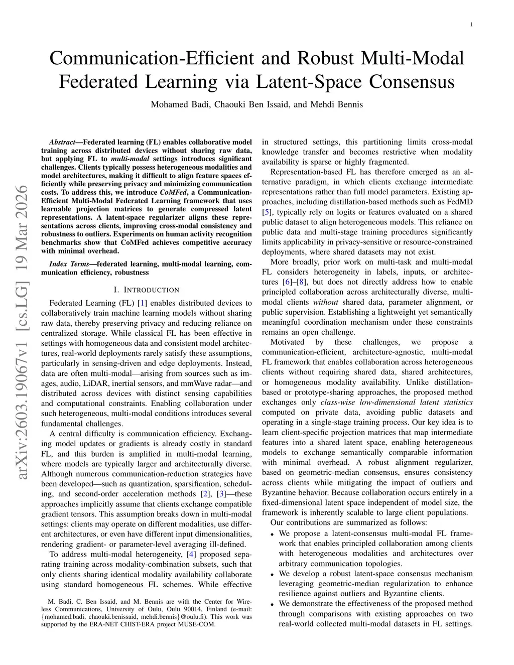 Communication-Efficient and Robust Multi-Modal Federated Learning via Latent-Space Consensus