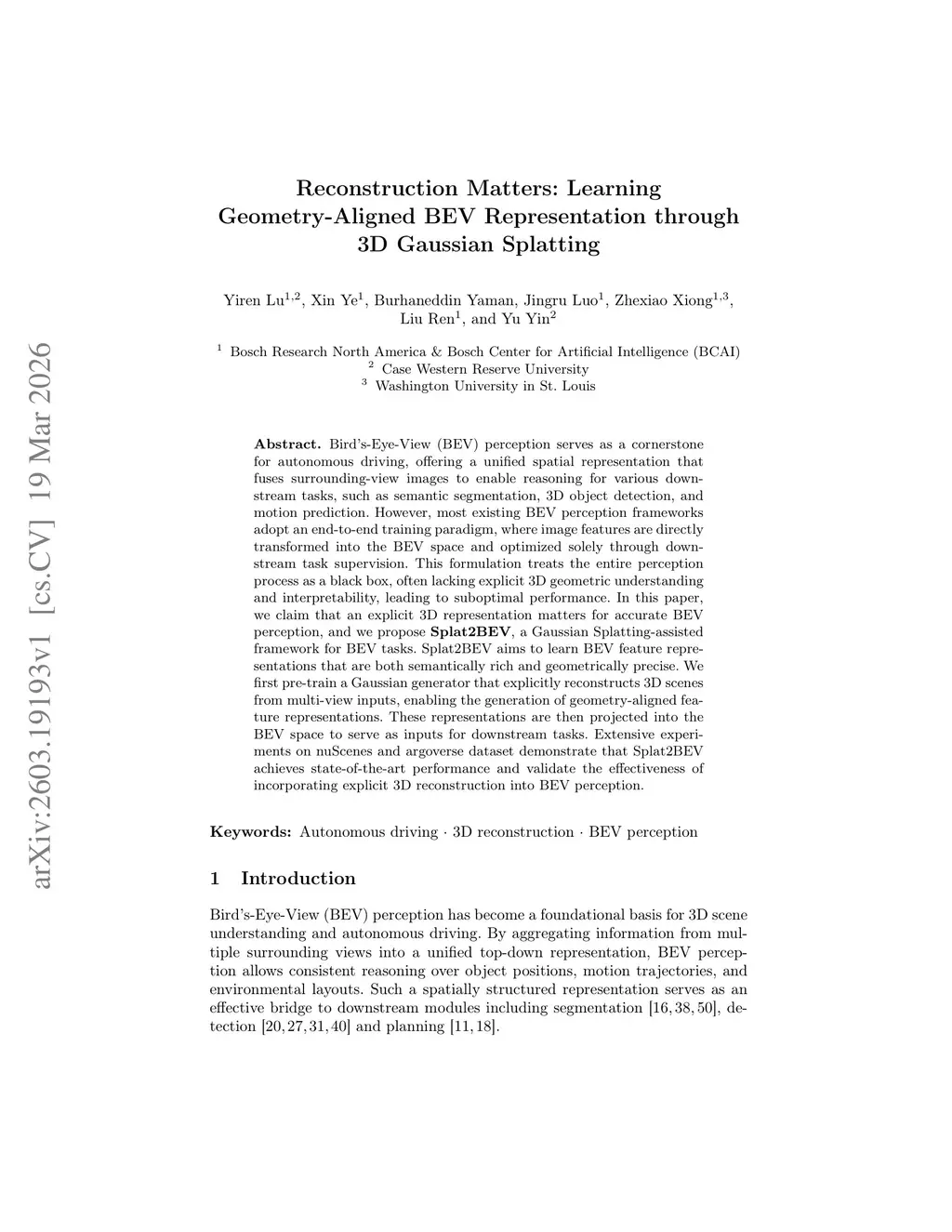 Bird's-Eye-View (BEV) perception serves as a cornerstone for autonomous driving, offering a unified spatial representation that fuses surrounding-view images to enable reasoning for various downstream tasks, such as semantic segmentation, 3D object detection, and motion prediction. However, most existing BEV perception frameworks adopt an end-to-end training paradigm, where image features are directly transformed into the BEV space and optimized solely through downstream task supervision. This formulation treats the entire perception process as a black box, often lacking explicit 3D geometric understanding and interpretability, leading to suboptimal performance. In this paper, we claim that an explicit 3D representation matters for accurate BEV perception, and we propose Splat2BEV, a Gaussian Splatting-assisted framework for BEV tasks. Splat2BEV aims to learn BEV feature representations that are both semantically rich and geometrically precise. We first pre-train a Gaussian generator that explicitly reconstructs 3D scenes from multi-view inputs, enabling the generation of geometry-aligned feature representations. These representations are then projected into the BEV space to serve as inputs for downstream tasks. Extensive experiments on nuScenes and argoverse dataset demonstrate that Splat2BEV achieves state-of-the-art performance and validate the effectiveness of incorporating explicit 3D reconstruction into BEV perception.