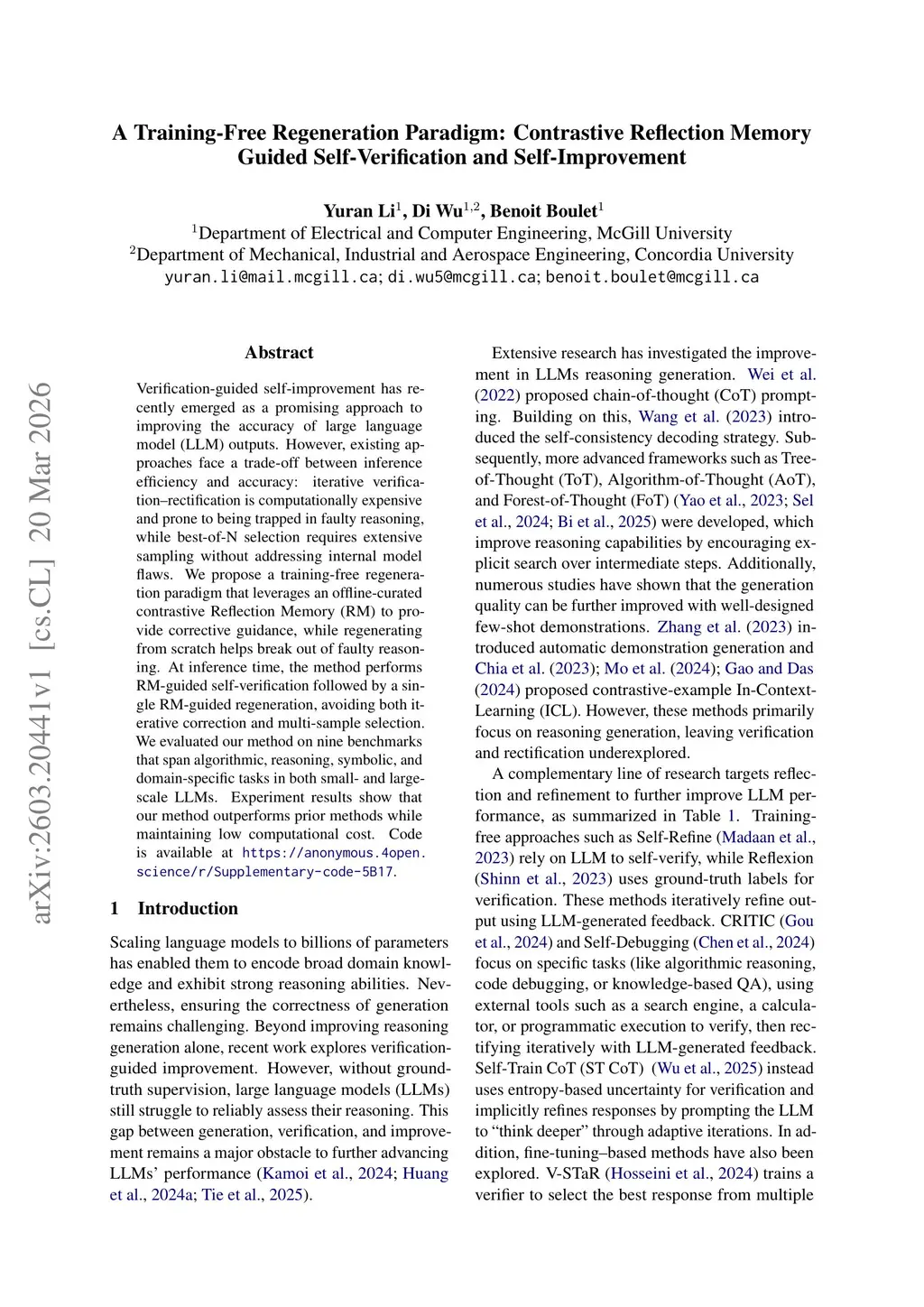 A Training-Free Regeneration Paradigm: Contrastive Reflection Memory Guided Self-Verification and Self-Improvement