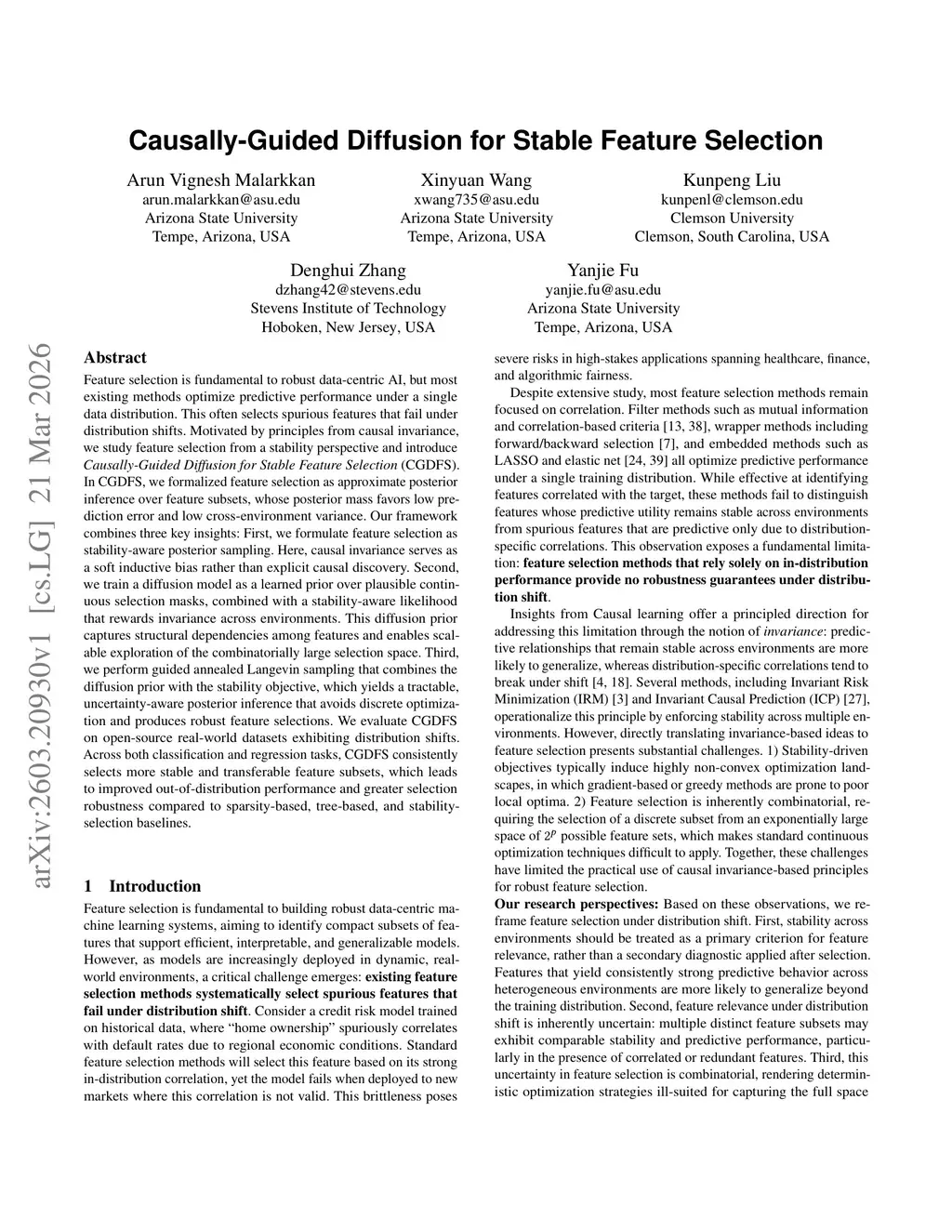 Feature selection is fundamental to robust data-centric AI, but most existing methods optimize predictive performance under a single data distribution. This often selects spurious features that fail under distribution shifts. Motivated by principles from causal invariance, we study feature selection from a stability perspective and introduce Causally-Guided Diffusion for Stable Feature Selection (CGDFS). In CGDFS, we formalized feature selection as approximate posterior inference over feature subsets, whose posterior mass favors low prediction error and low cross-environment variance. Our framework combines three key insights: First, we formulate feature selection as stability-aware posterior sampling. Here, causal invariance serves as a soft inductive bias rather than explicit causal discovery. Second, we train a diffusion model as a learned prior over plausible continuous selection masks, combined with a stability-aware likelihood that rewards invariance across environments. This diffusion prior captures structural dependencies among features and enables scalable exploration of the combinatorially large selection space. Third, we perform guided annealed Langevin sampling that combines the diffusion prior with the stability objective, which yields a tractable, uncertainty-aware posterior inference that avoids discrete optimization and produces robust feature selections. We evaluate CGDFS on open-source real-world datasets exhibiting distribution shifts. Across both classification and regression tasks, CGDFS consistently selects more stable and transferable feature subsets, which leads to improved out-of-distribution performance and greater selection robustness compared to sparsity-based, tree-based, and stability-selection baselines.